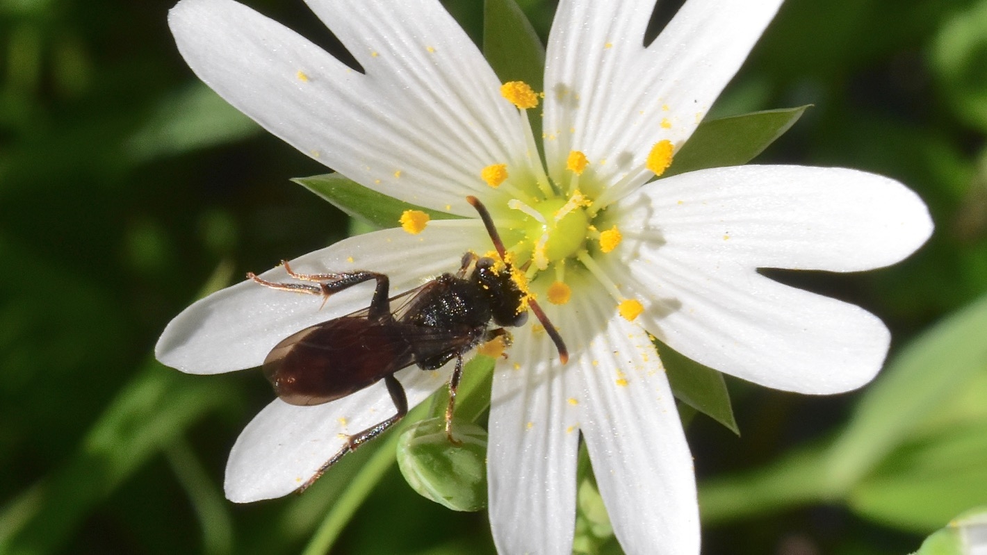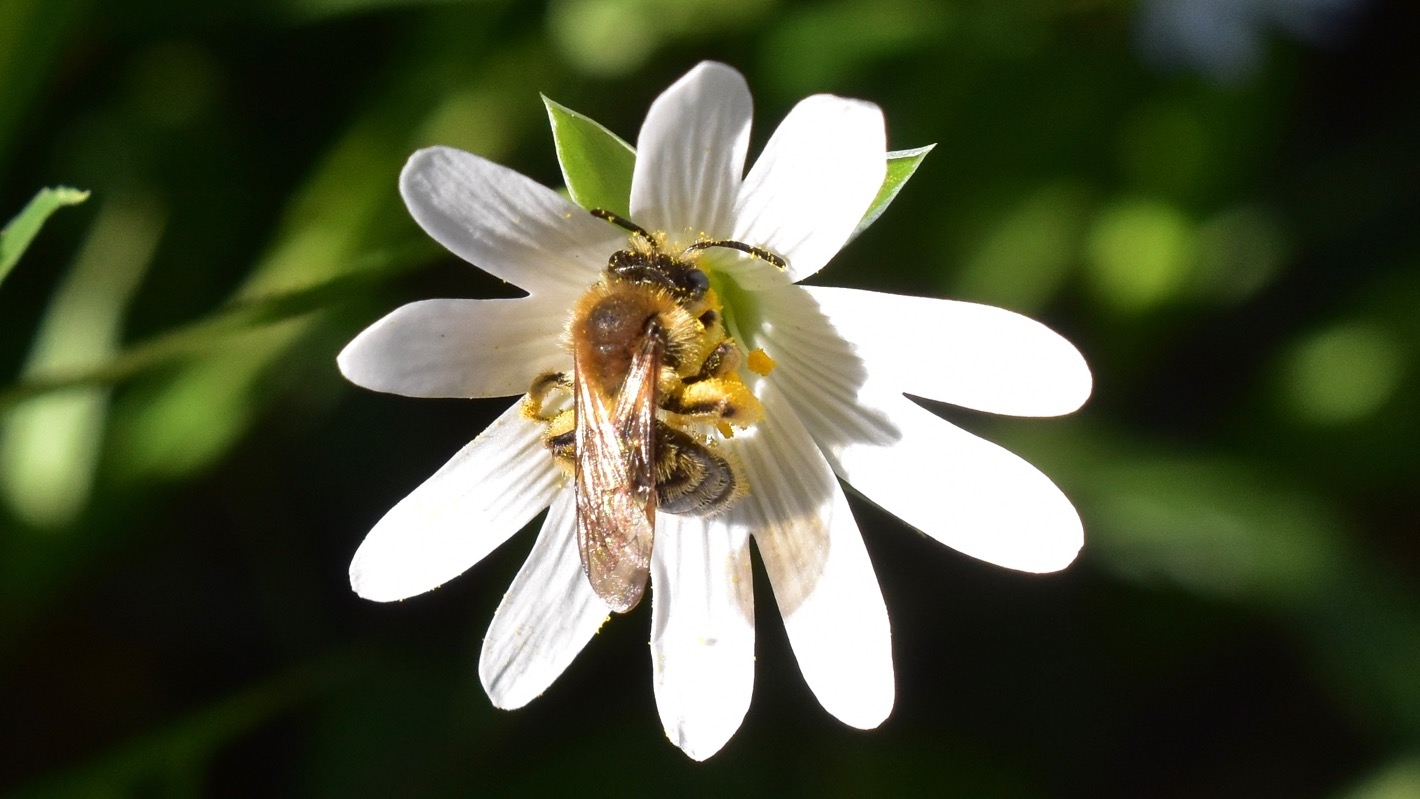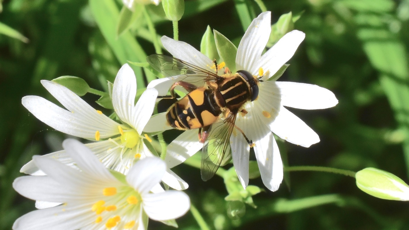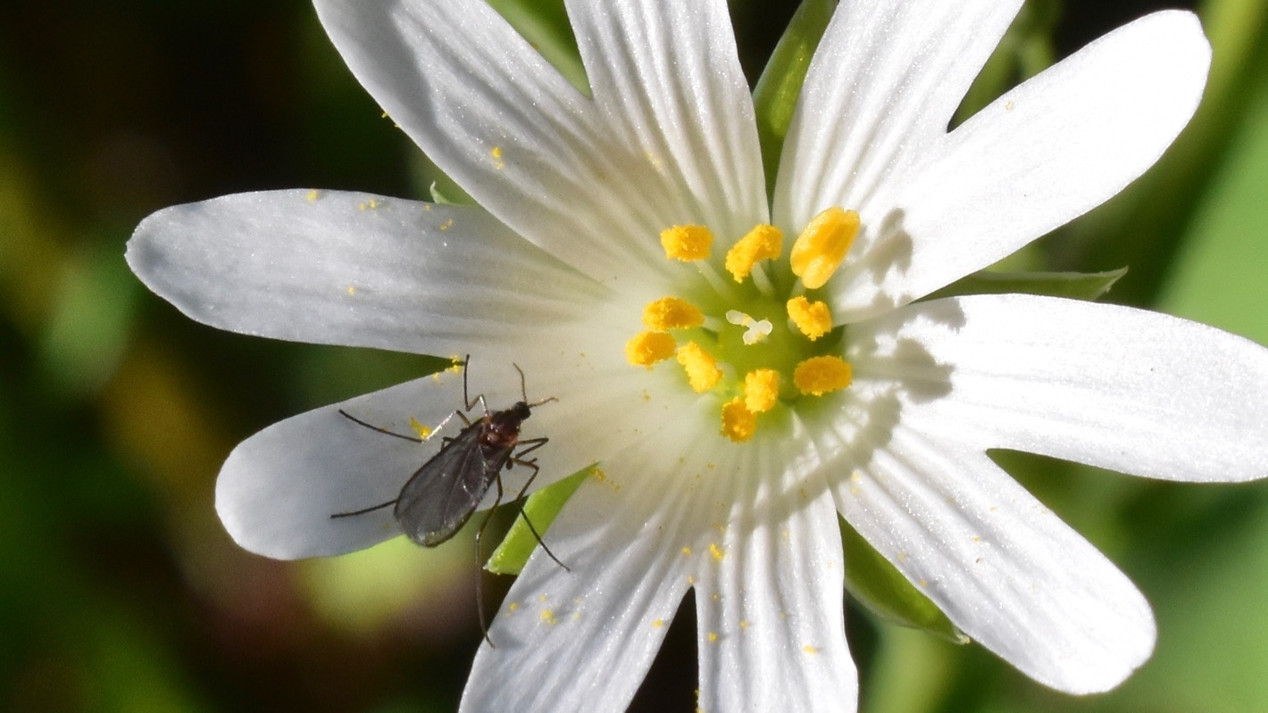 Bisher war ich nur einmal drei Stunden lang dort. Davon verbrachte ich 30 Minuten am Wegrand beim Fotografieren der vielfältigen Tierwelt, die hier gerade die Blüten der Sternmiere besuchte.