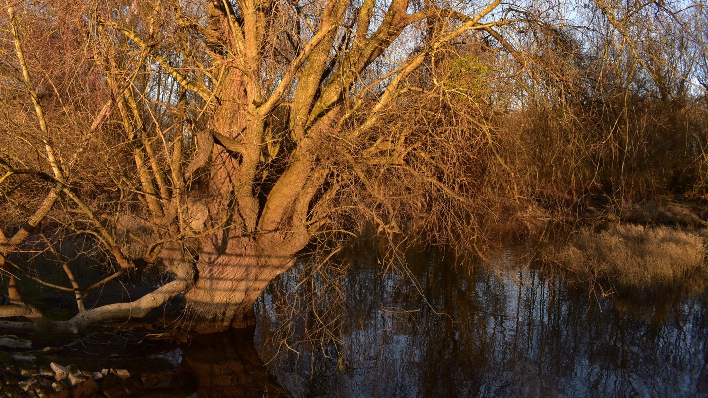 Neben dem Rheinhafen mündet ein kleines Stück Altrhein in den Rhein. Hier wachsen einige besonders alte Weiden.