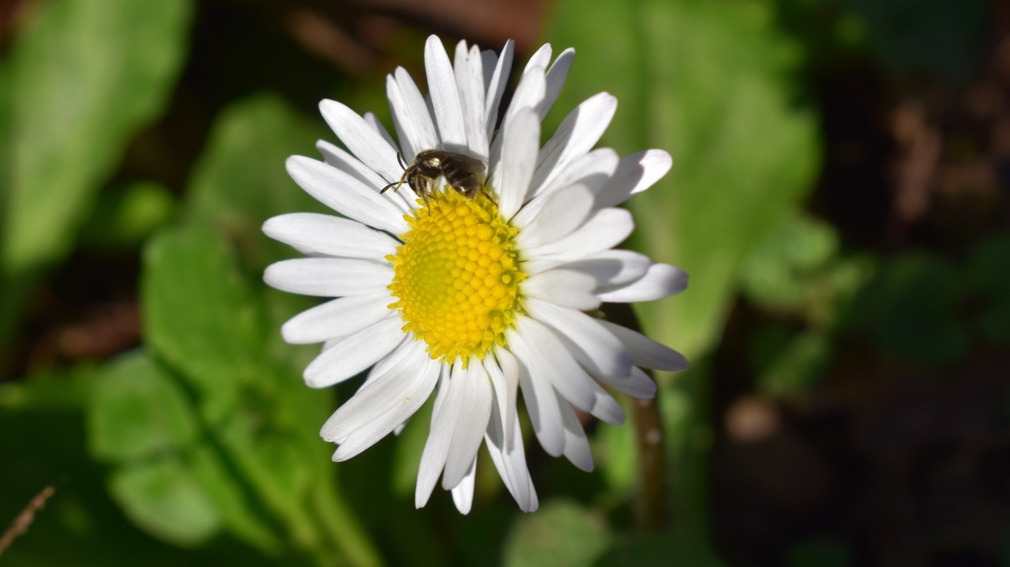 Gänseblümchen zählen zu den ersten Vorboten des Frühlings. Sobald die ersten Blüten erscheinen, sind auch schon die ersten Bienen unterwegs. Diese winzige Biene ist vermutlich eine Schmalbienenart.