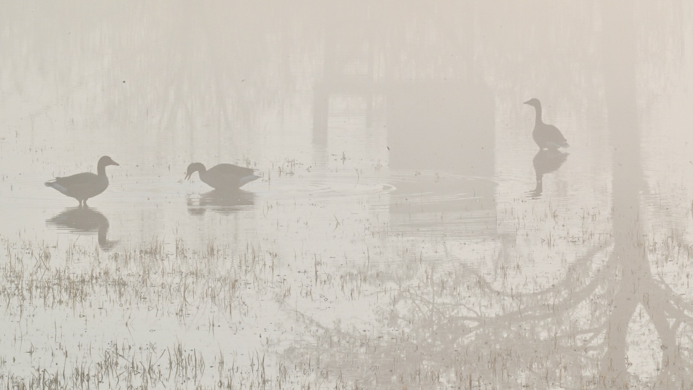 Wenn im Winter Teile der Wasserfläche zugefroren sind, drängen sich viele verschiedene Entenarten, Blässhühner, Haubentaucher, Zwergtaucher und mehr an den eisfreien Flächen.