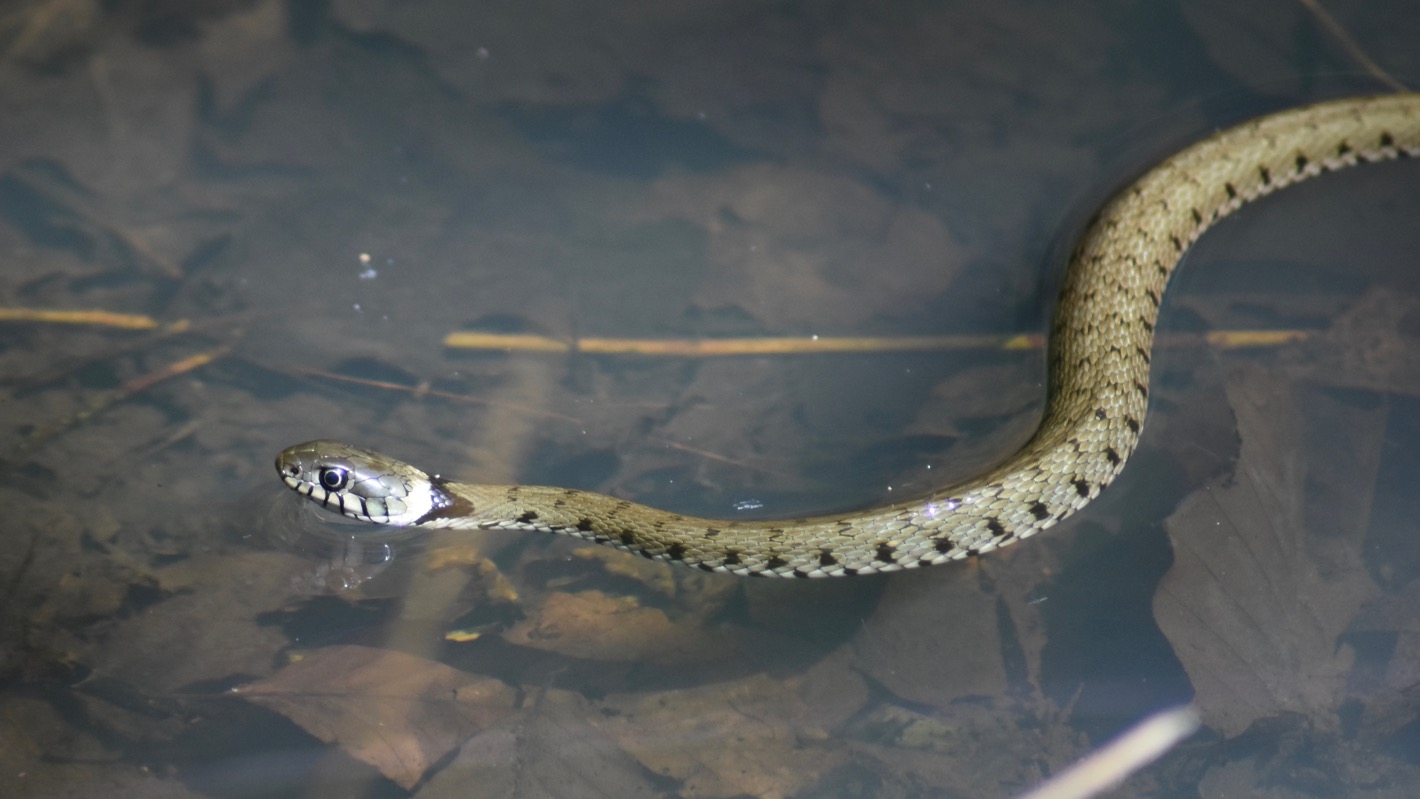 Es gibt aber in diesem NSG nicht nur trockene sondern auch feuchte Lebensräume. Im Norden des Gebiets befindet sich ein kleiner, fast komplett von dichter Vegetation umschlossener Baggersee. Nur an einer Stelle kann man von einem hier endenden Weg auf das Wasser blicken. Der Zugang zu dieser Stelle war aber im Spätsommer 2025 durch einen umgestürzten Baum versperrt.