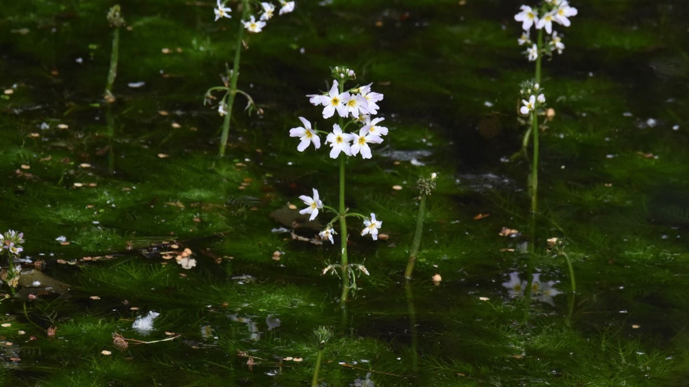 Hier entdecke ich in einem kleinen Tümpel neben dem Wanderweg die seltene Wasserfeder.