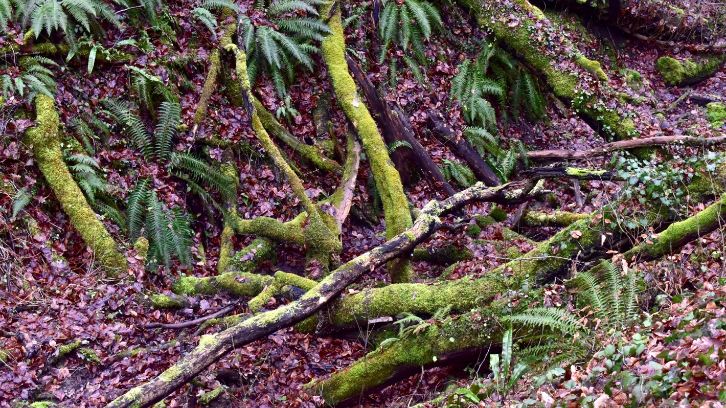 Besonders schützenswert ist die Ungeheuerklamm vor allem wegen besonders vieler seltener Moos- und Flechtenarten. Ich vermute, dass die interessantesten von ihnen im besonders feuchten Mikroklima am Boden der Klamm wachsen. Da ich aber grundsätzlich nur von öffentlichen Wegen aus fotografiere, beschränke ich mich hier auf ein paar Fotos, die ich an einem trüben Wintertag am Wegrand aufgenommen habe.