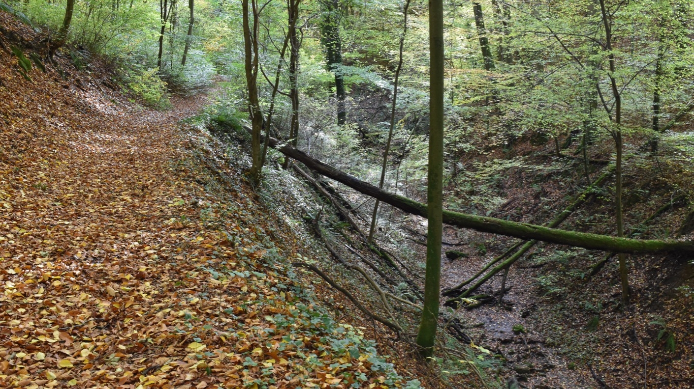 Die Ungeheuerklamm liegt zwischen Untergrombach und Bruchsal am Rand der Rheinebene. Man sollte bei diesem Namen keine spektakuläre Schlucht erwarten, wie wir sie z.B. aus den Alpen kennen. Hier ist es nur ein relativ harmloser Graben, den das nur manchmal fließende Wasser in den Lößboden des Kraichgau gegraben hat.