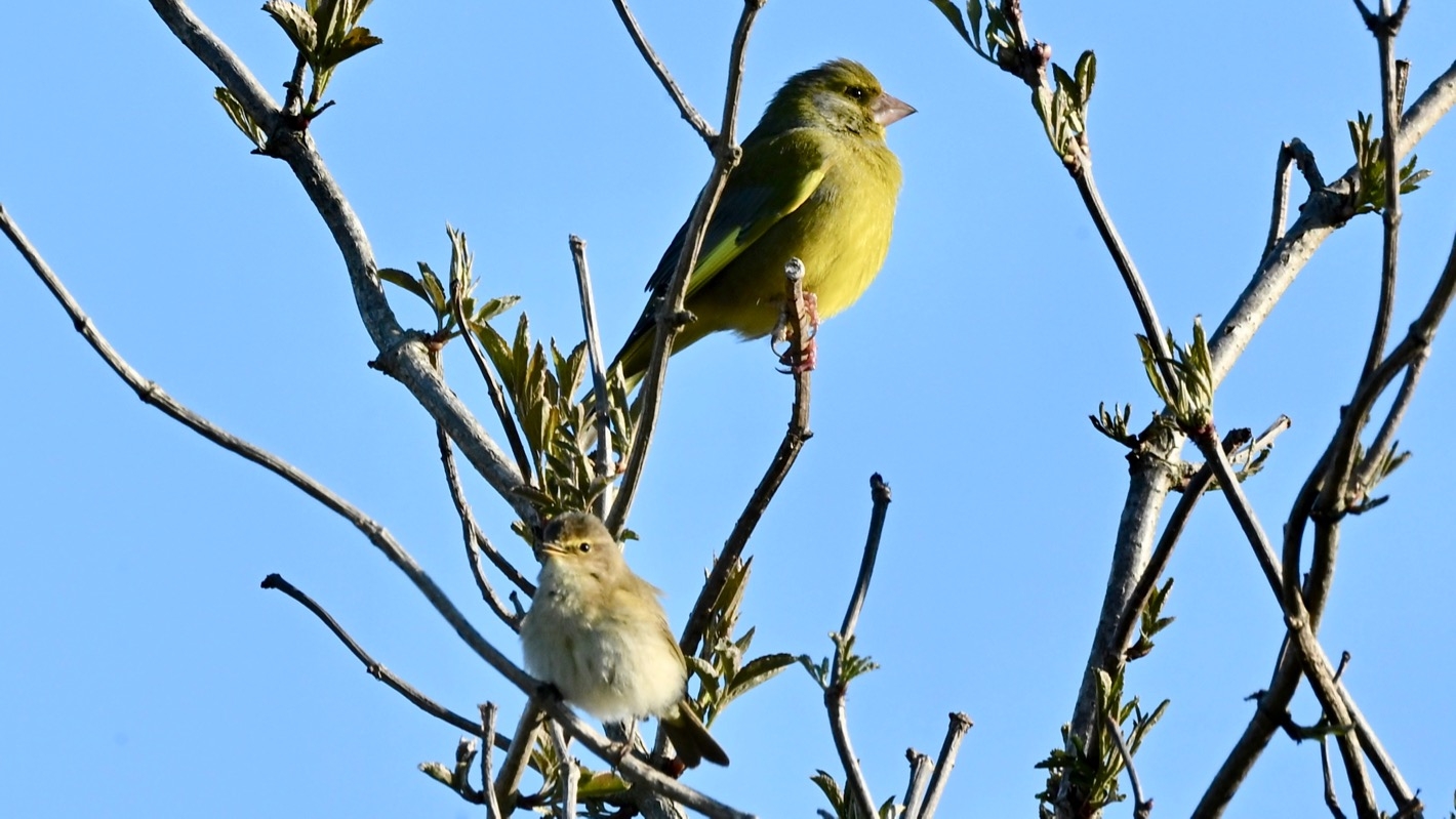 Als ich einen Grünfink fotografiere, setzt sich ein Zipzalp auf einen Zweig darunter.