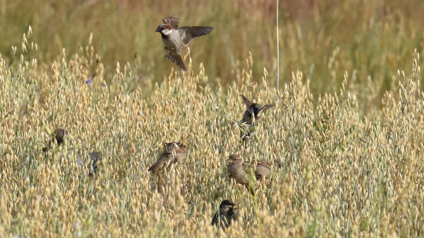 An diesem Morgen fliegen ein paar Dutzend Haussperlinge pausenlos zwischen den Gärten am Ortsrand und den Wiesen hin und her.