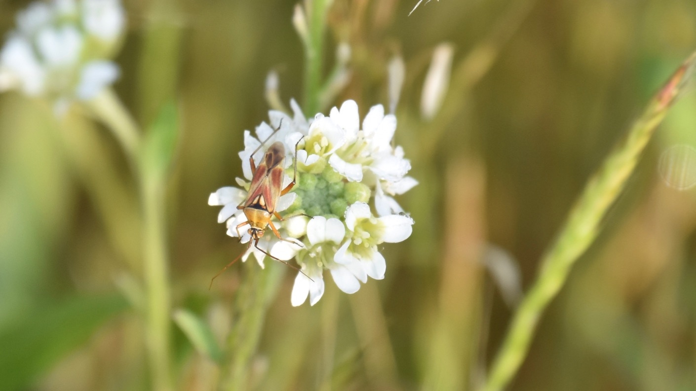 Eine Rotfleckige Schmuckwanze sitzt auf Gewöhnlicher Graukresse.