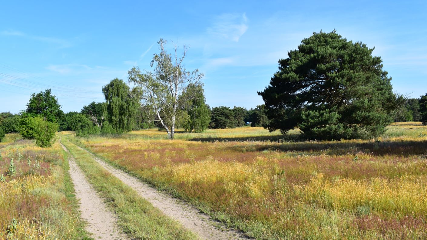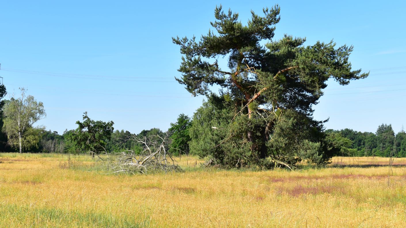 Einzelne knorrige Kiefern, Birken und wenige andere Bäume lockern die offenen, sehr sonnigen Flächen auf.