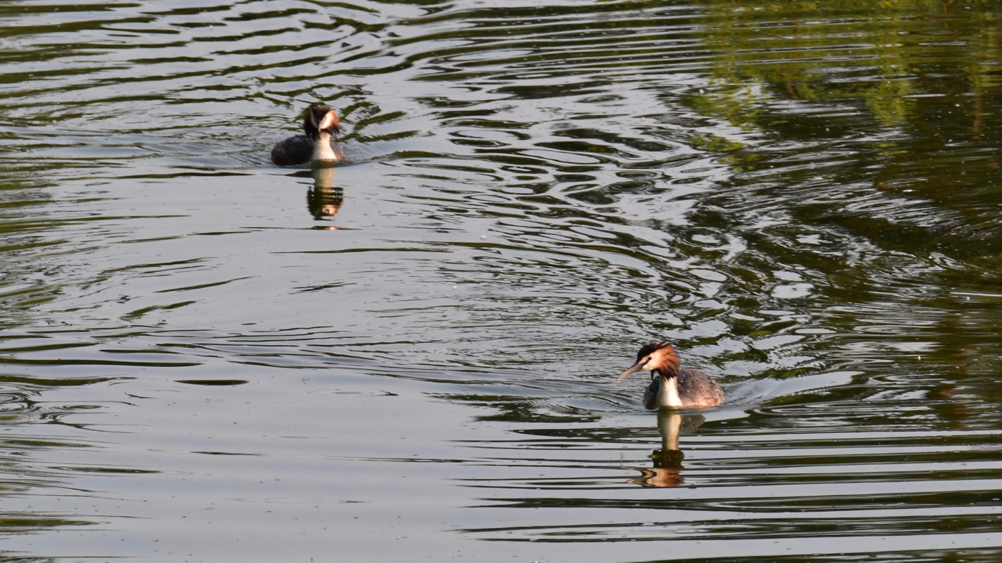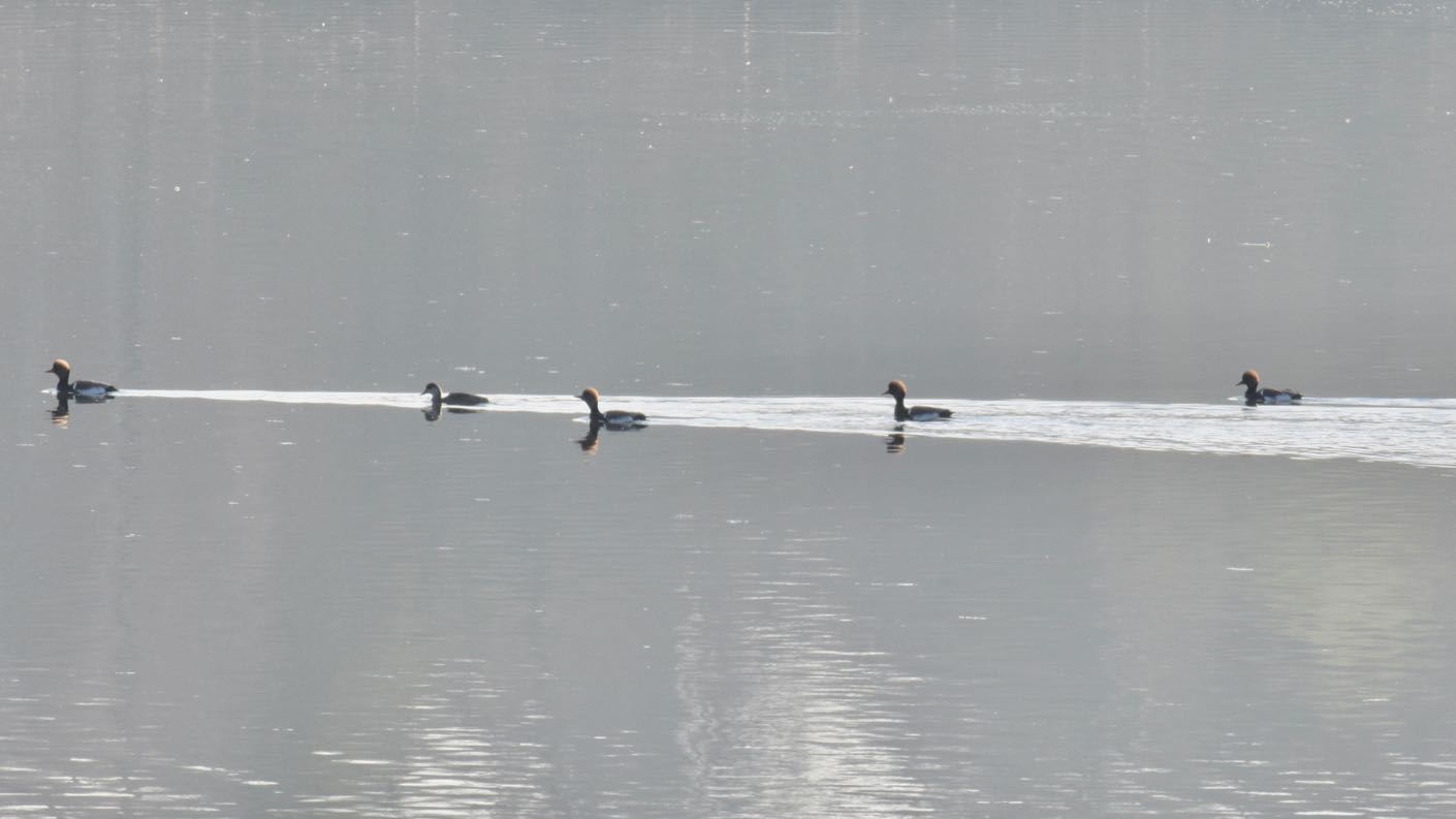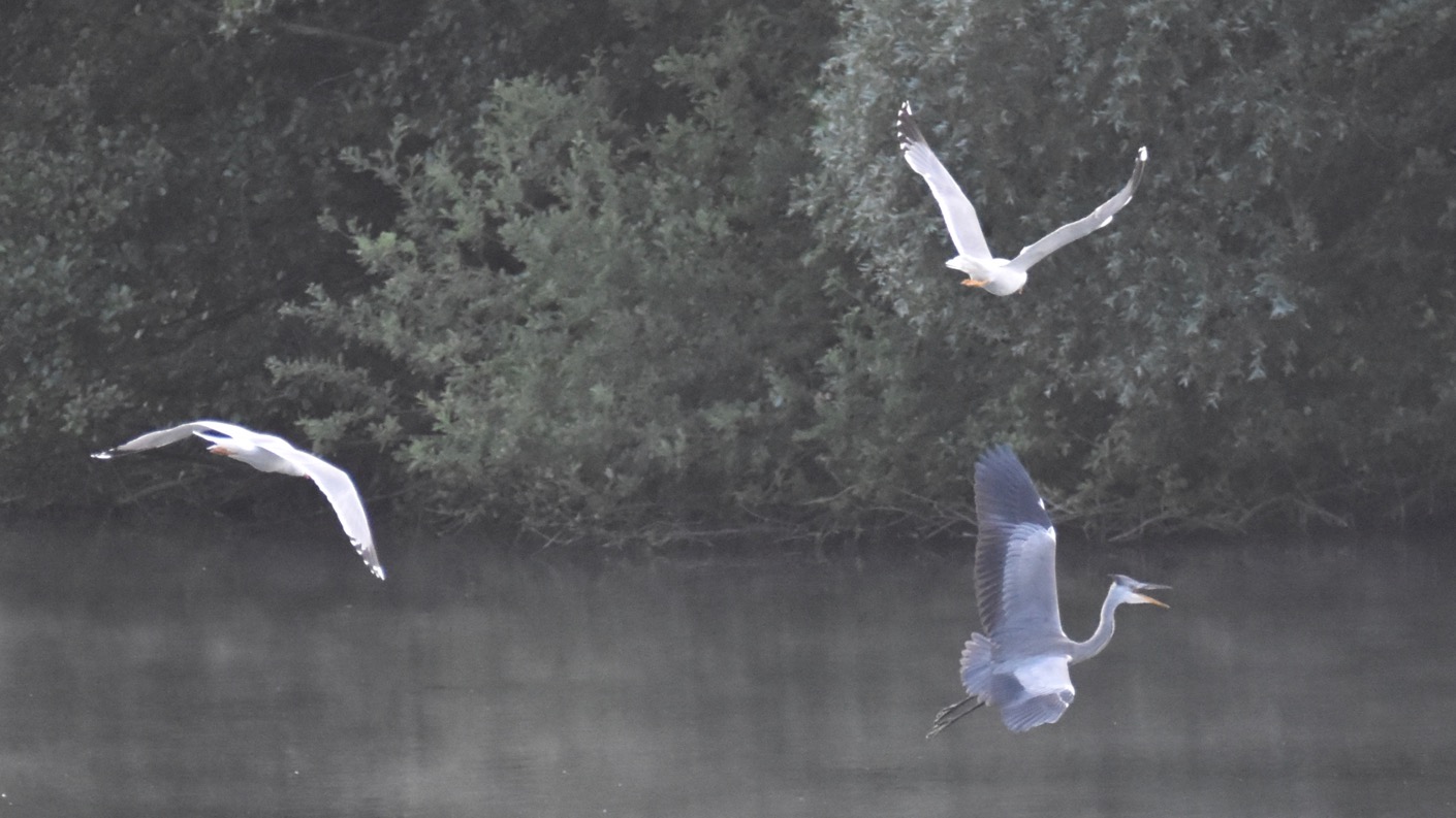 An einem Morgen kann ich hier beobachten, wie zwei Möwen mehrere Minuten lang einen heftigen Luftkampf gegen einen Graureiher führen. Wirklich kinoreif! Schließlich gelingt es ihnen, den wohl völlig entnervten Reiher zu vertreiben.