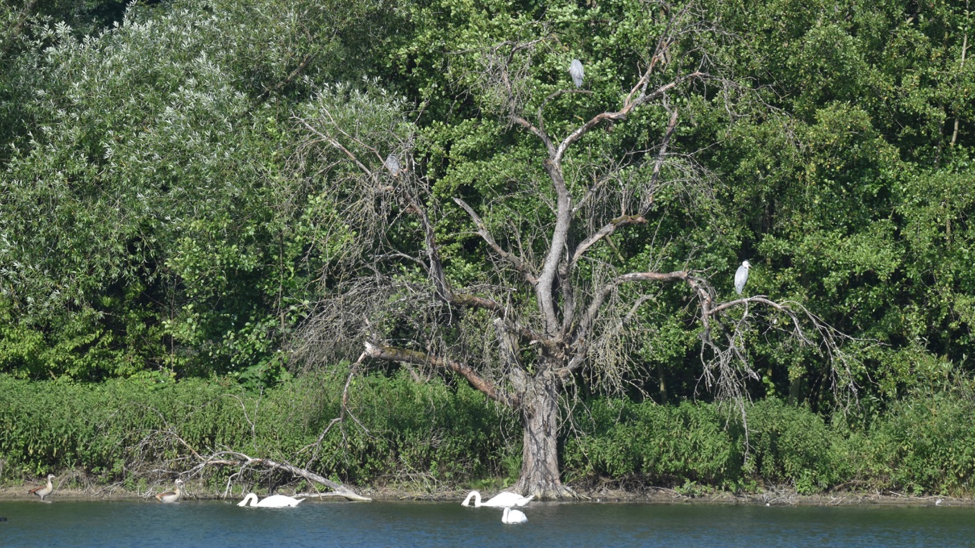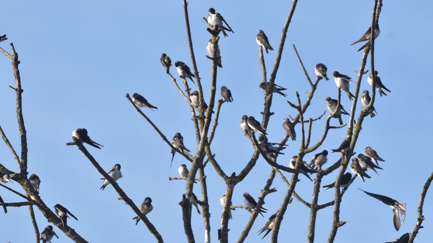 Im Spätsommer versammeln sich auf einem kahlen Baum am Ufer sehr viele Mehlschwalben, Rauchschwalben und Uferschwalben.