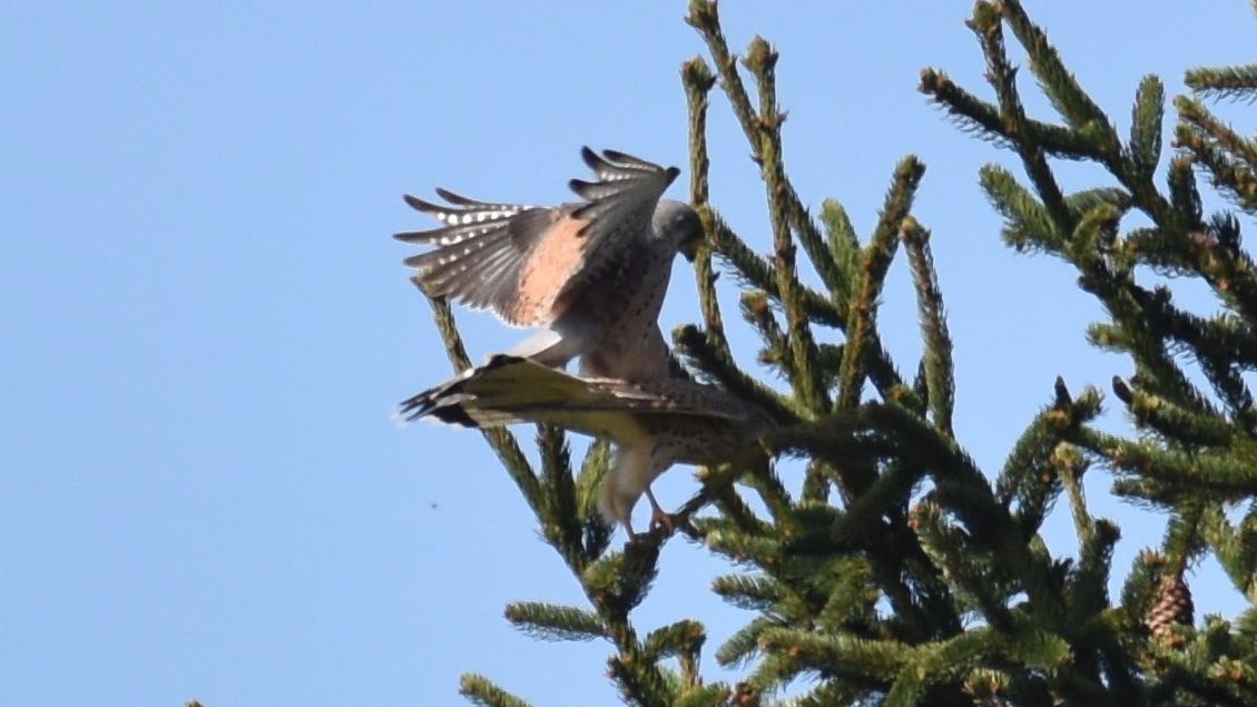 Manchmal muss man einfach Glück haben. Zufällig richte ich meine Kamera gerade auf einen Turmfalken, der auf einem Baum sitzt. Wenige Sekunden später kann ich Turmfalken bei der Paarung fotografieren.