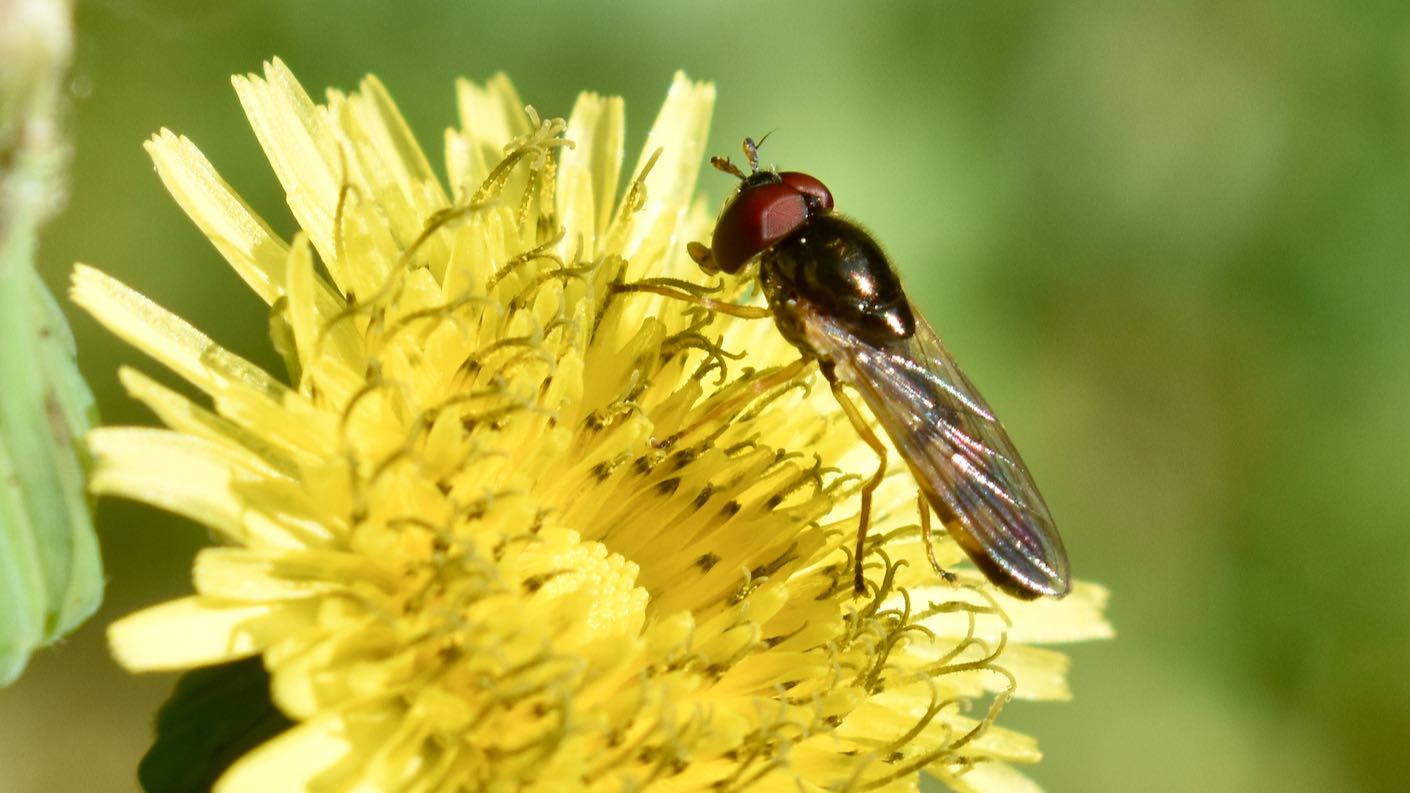 Eigentlich blieb ich hier nur stehen, um Bienen auf Blüten zu fotografieren. Erst als ich wunderte, warum eine Biene trotz naher Kamera sitzen blieb, erkannte ich die gut getarnte Krabbenspinne, welche die Biene erbeutet hatte.