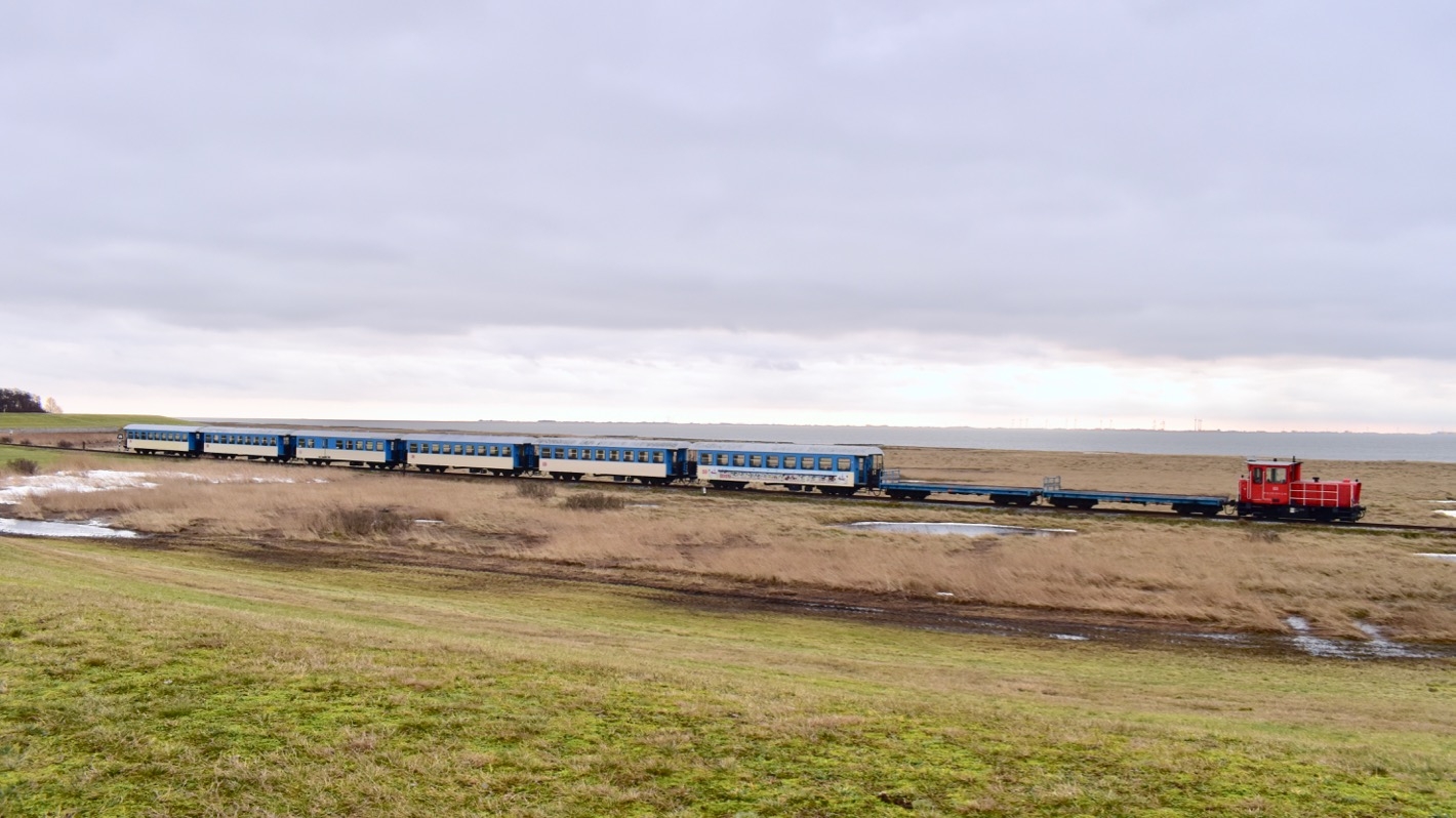 Im Preis für die Überfahrt ist auch die Bahnfahrt vom Inselhafen in den Ort Wangerooge inbegriffen. Die Bahnstrecke führt über die Lagune im Westaußengroden und bietet schöne Einblicke in diese Naturlandschaft, die man ansonsten nur von einem weiter entfernten Wanderweg sehen kann.