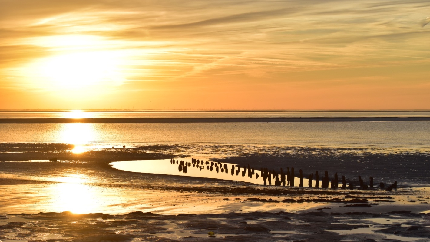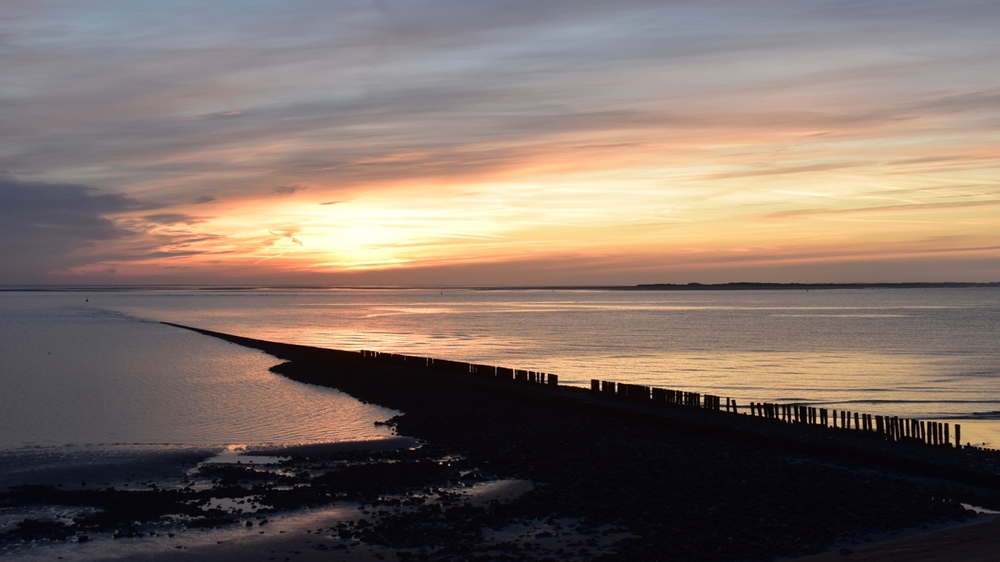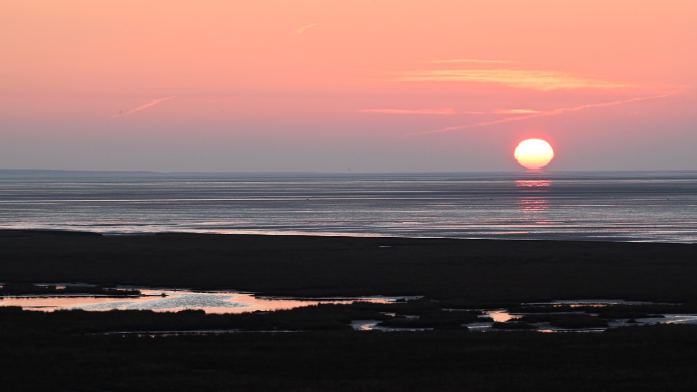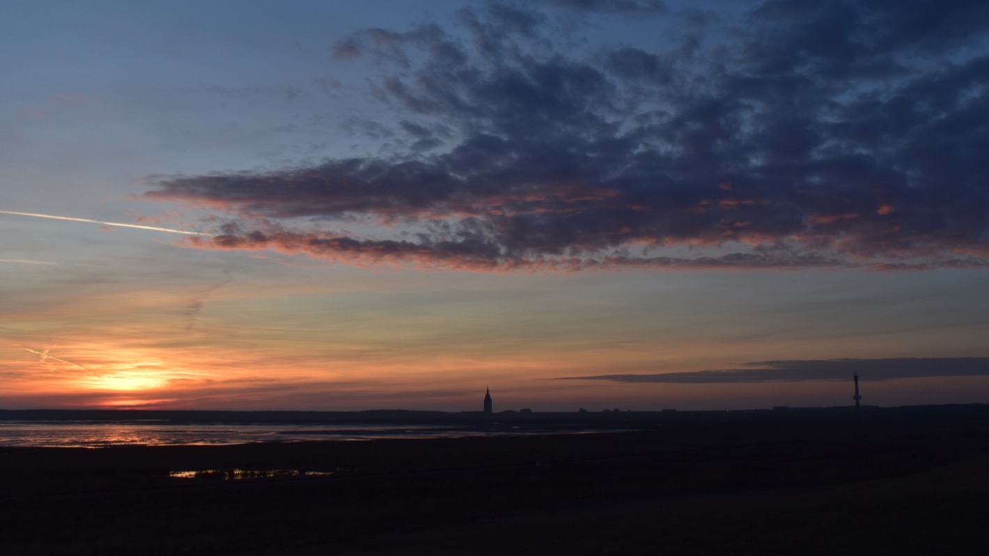Am Morgen sehen wir dann vom Ostdeich zwischen Flugplatz und Wattenmeer den Sonnenaufgang.