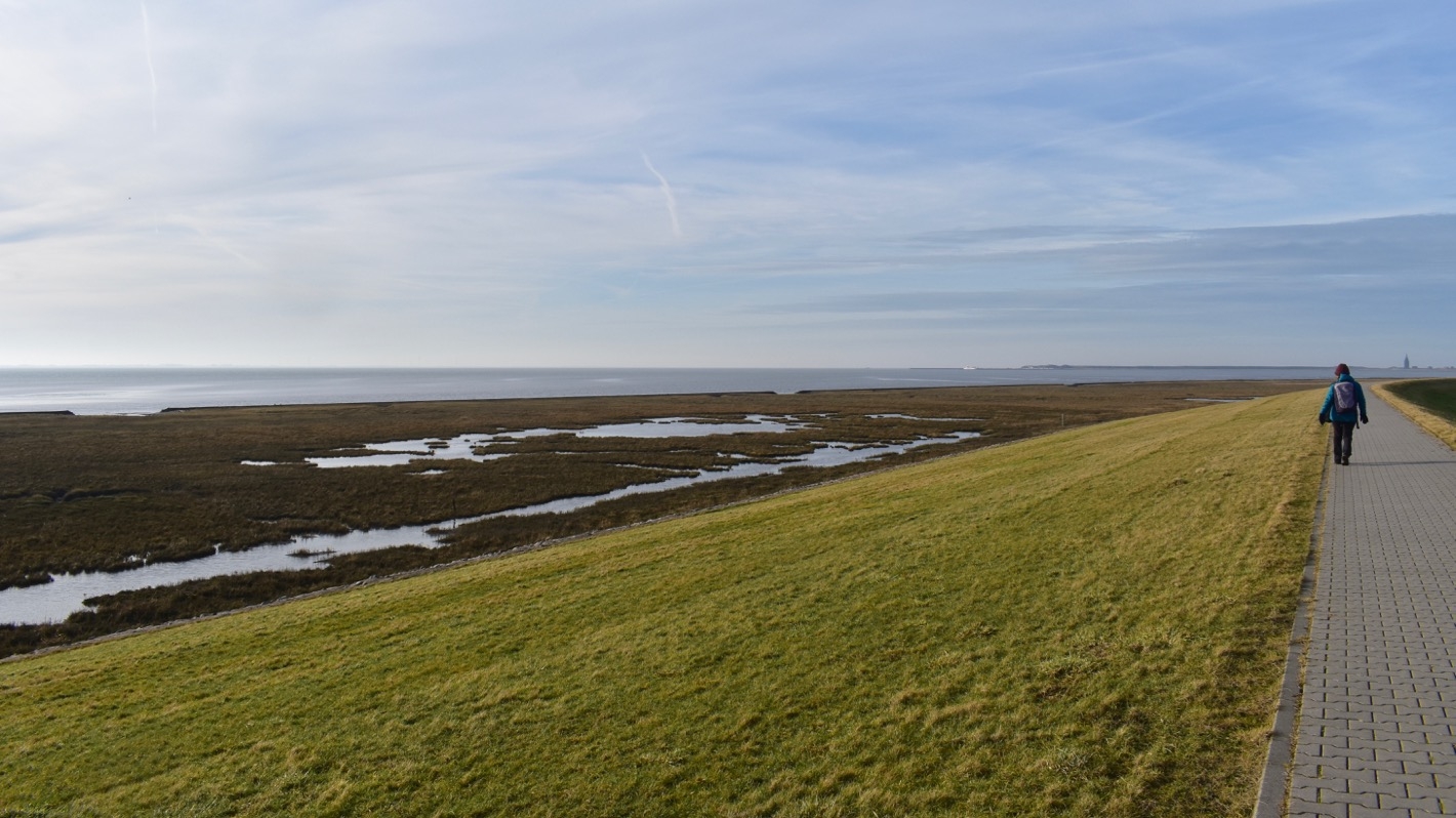 Schon eine Stunde nach unserer Ankunft spazieren Annette und ich auf dem Weg am Damm zwischen den Salzwiesen von Westaußengroden und Westinnengroden. Wir sehen unter anderem viele Weißwangengänse, aber auch Graugänse.