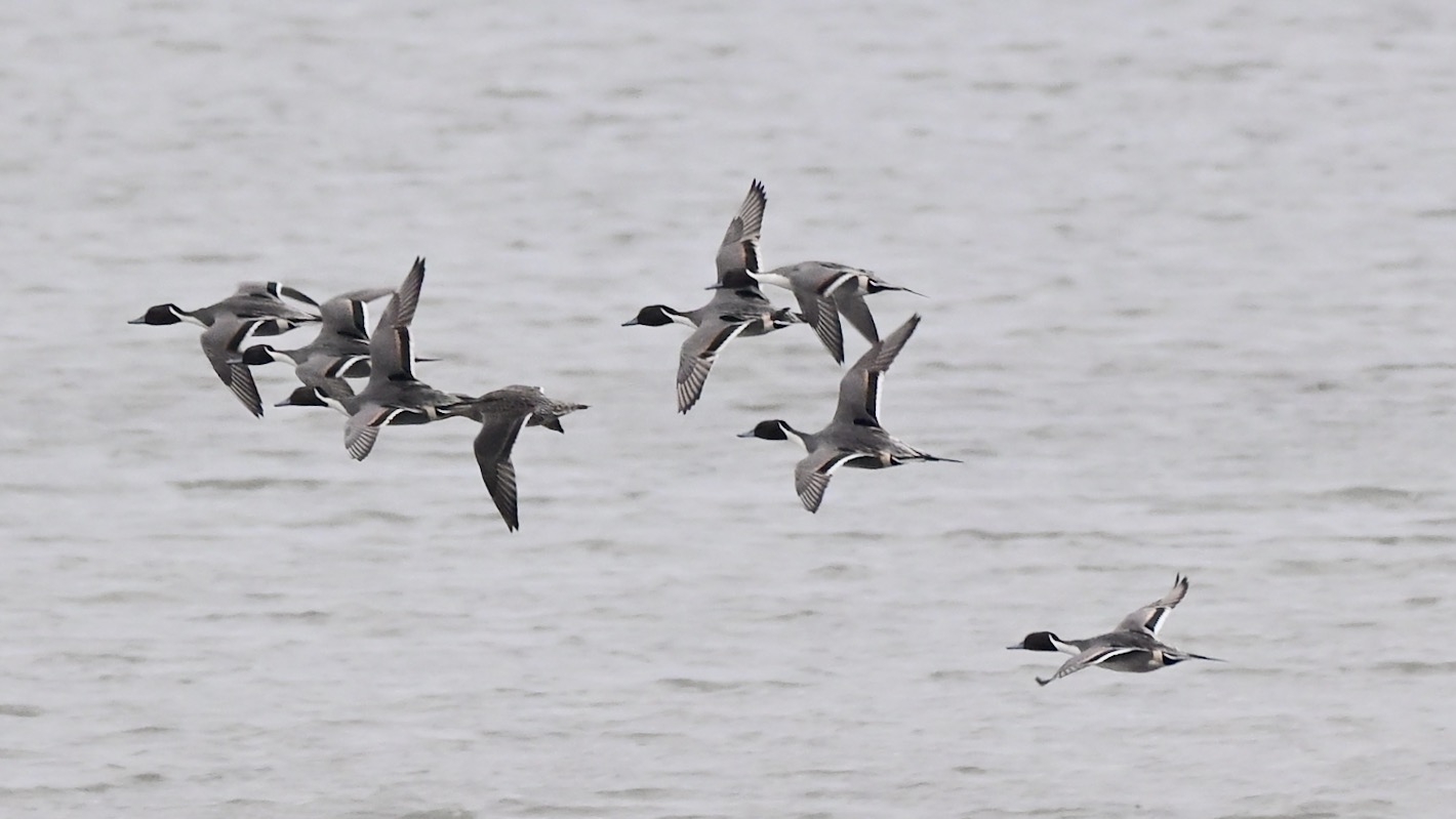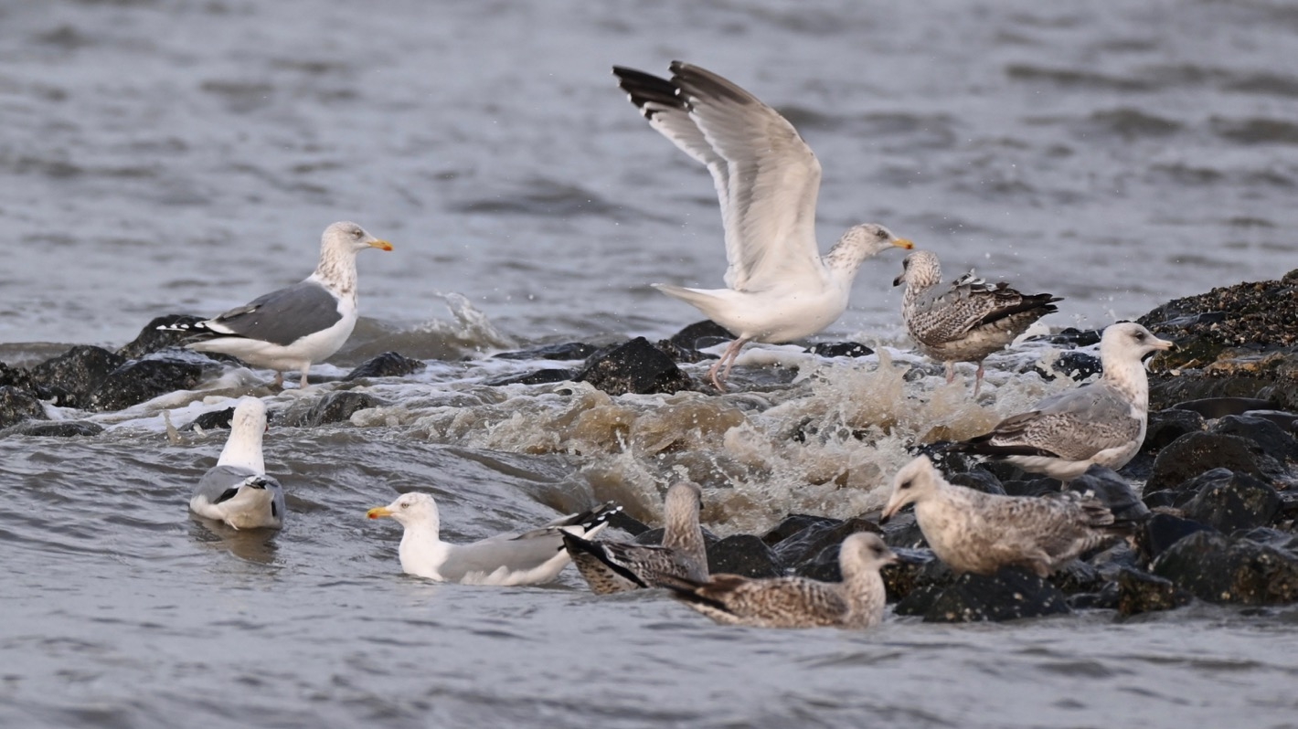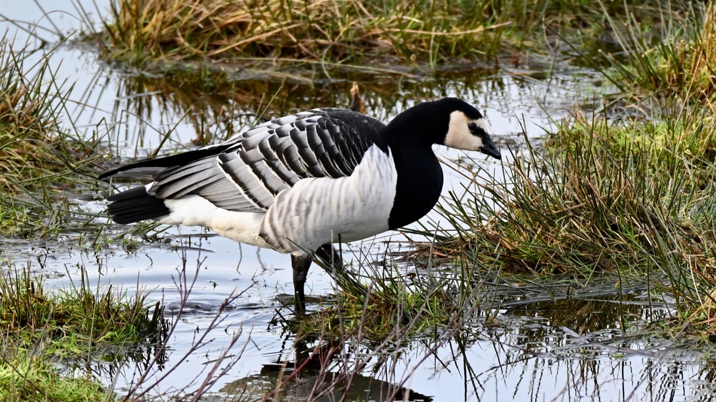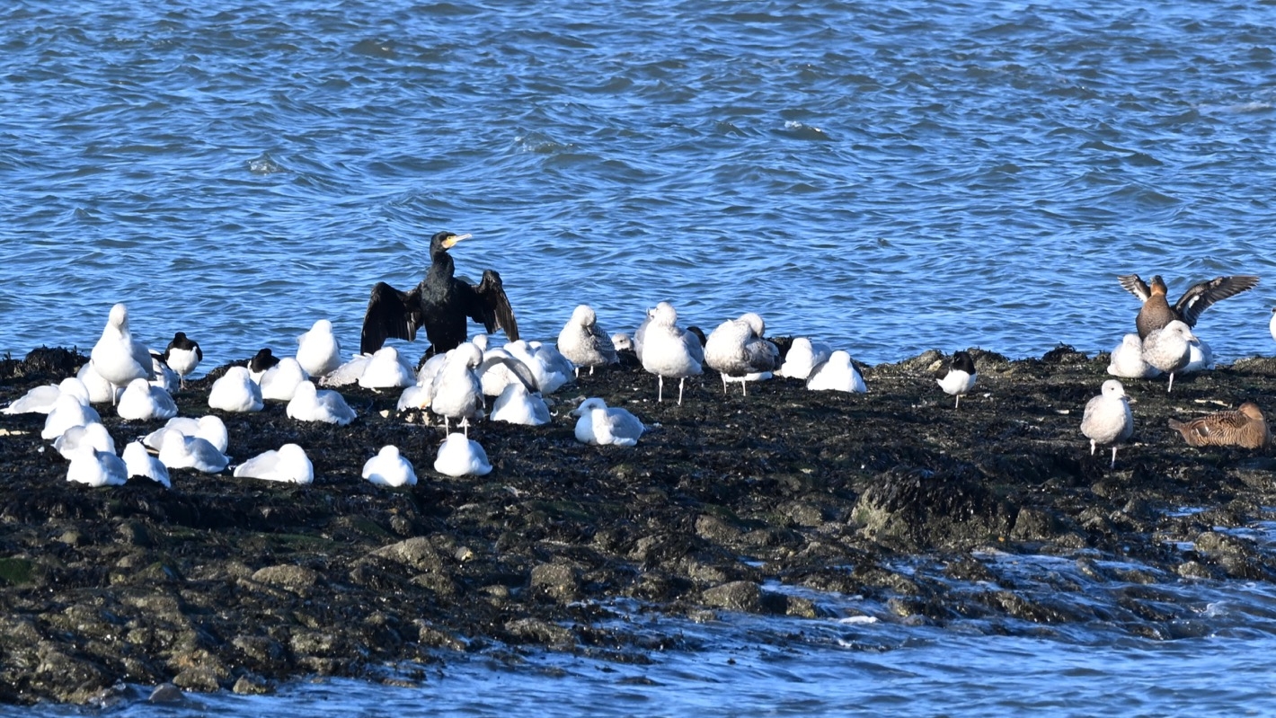 Momentan sind sehr viele Weißwangengänse und Ringelgänse hier, aber wir sehen auch einige Brandgänse.