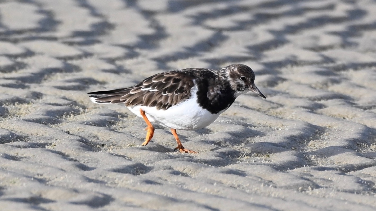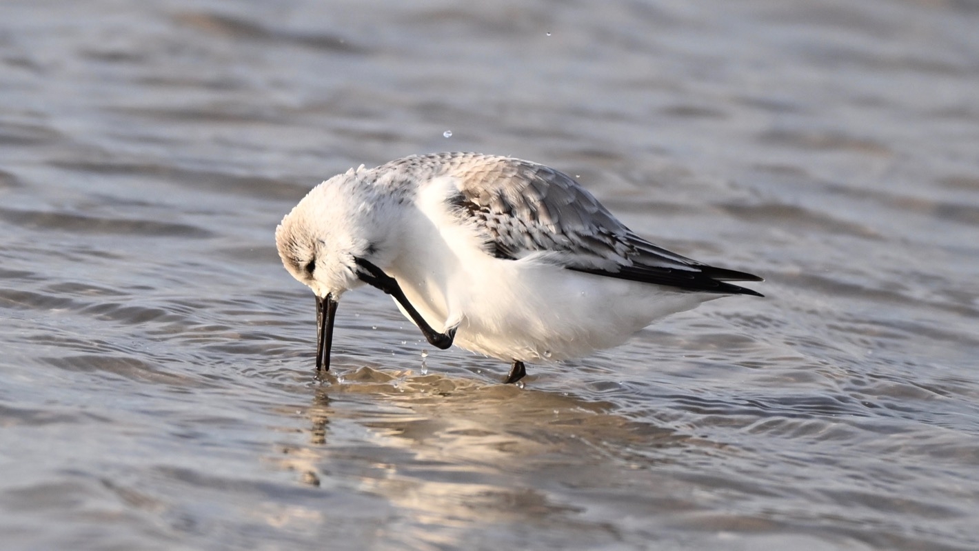 Hier rennen sehr viele Sanderlinge über den Sand und durch das flache Wasser. Wie gewohnt bleiben sie normalerweise kaum einen Moment lang stehen. Diesen erwischte ich, als er sich mit einem Fuß am Ohr kratzte. So beweglich würde ich auch gerne sein.