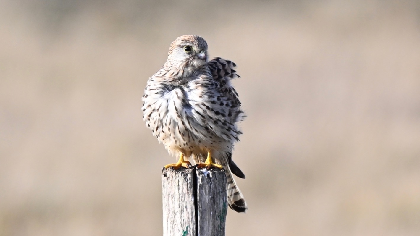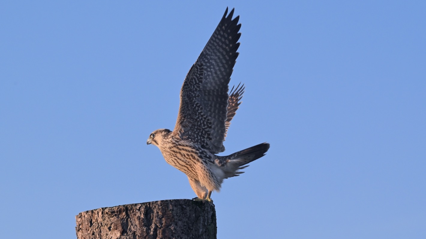 Auf einem der Pfosten an der Hafenausfahrt sitzt gerade ein Wanderfalke.