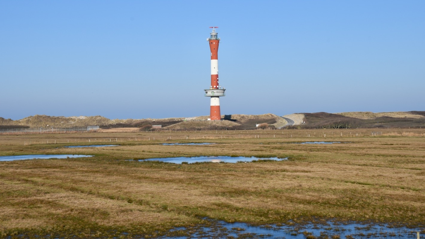 Nach dem Flugplatz biegt der Ostdeich nach Norden ab. Rechts von uns sehen wir nun die Salzwiesen des Ostaußengroden und in der Ferne die schmale Dünenkette an der Grenze zwischen dem Feuchtgebiet und dem Sandstrand im Norden.