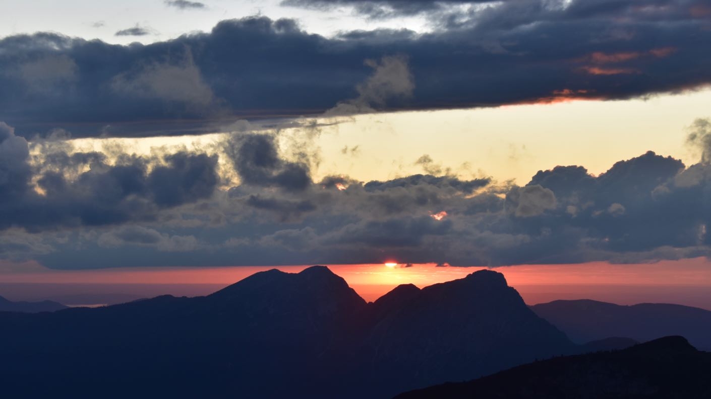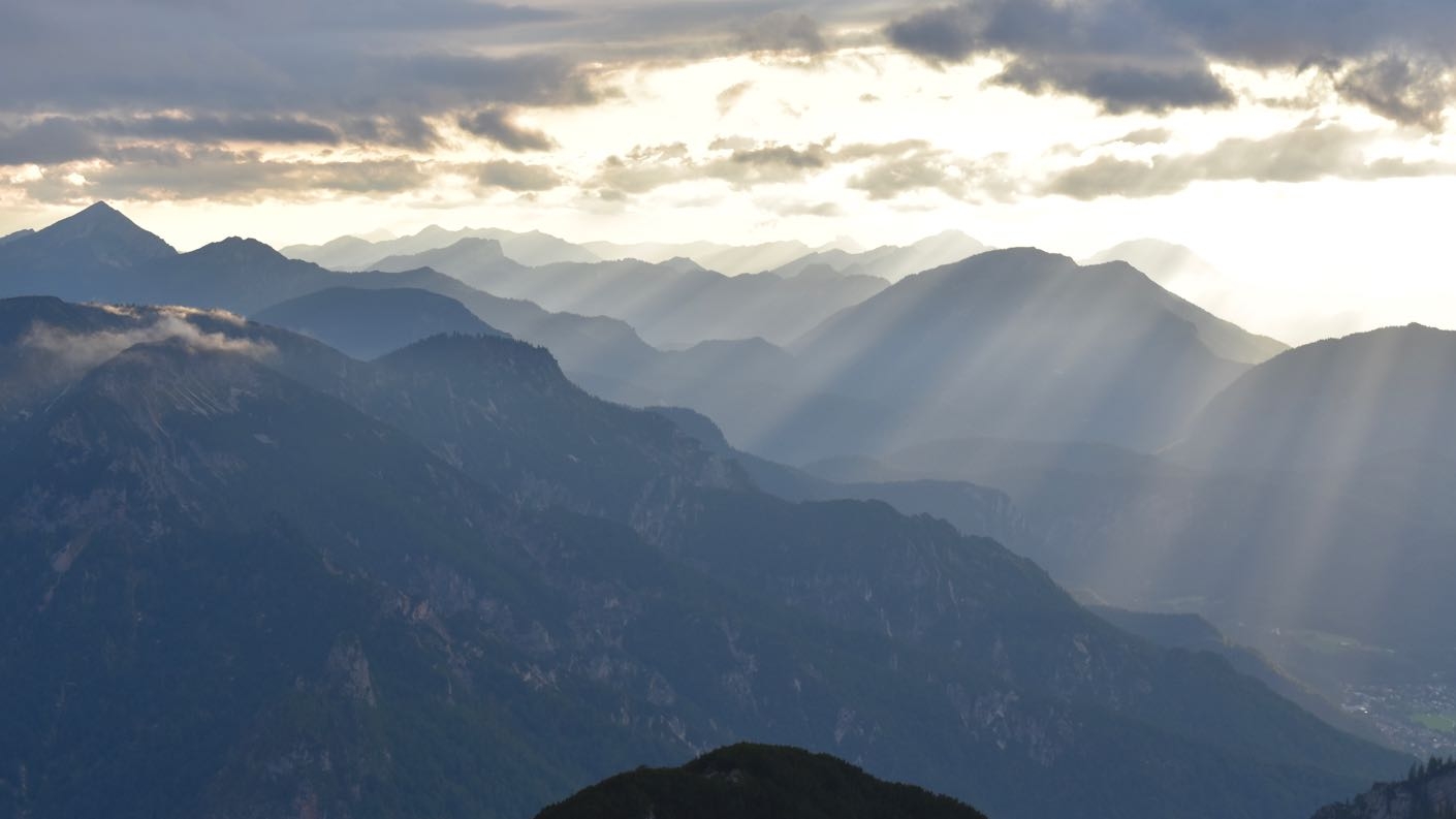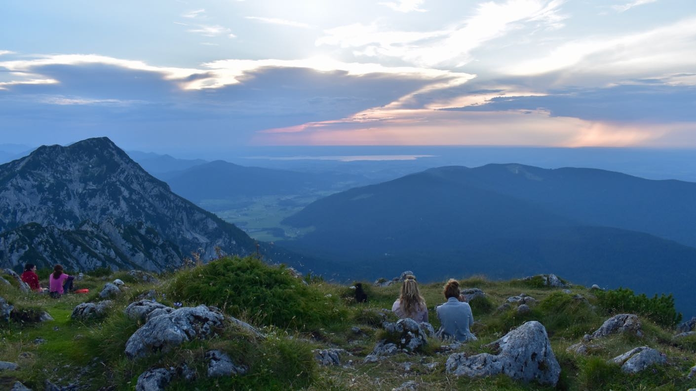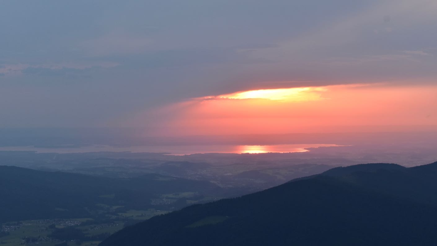 Heute gibt es wegen der dichten Wolkendecke zwar keinen spektakulären Sonnenuntergang, aber kurz bevor sie hinter dem Chiemsee am Horizont verschwindet, zeigt sich die Sonne doch noch.