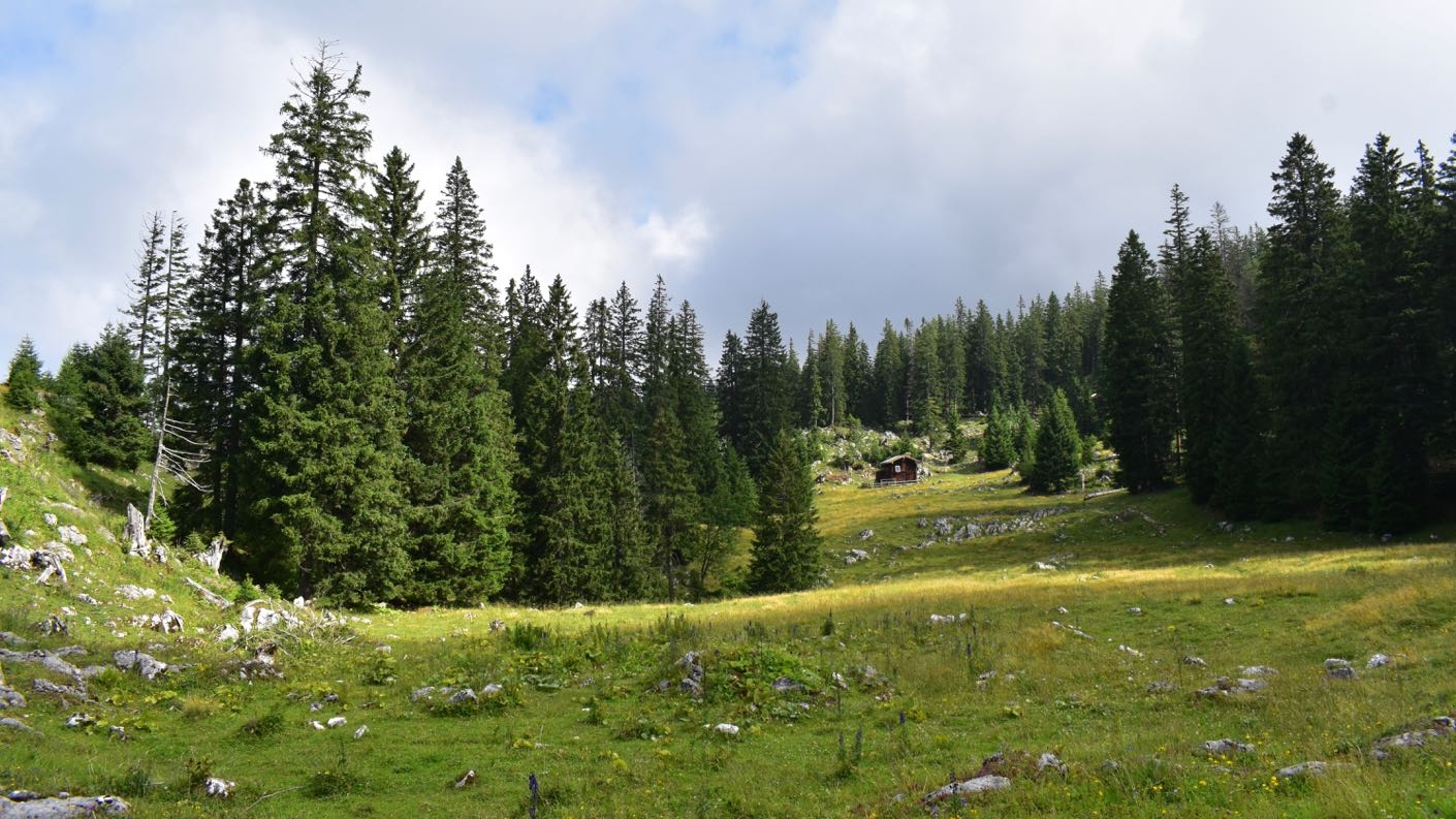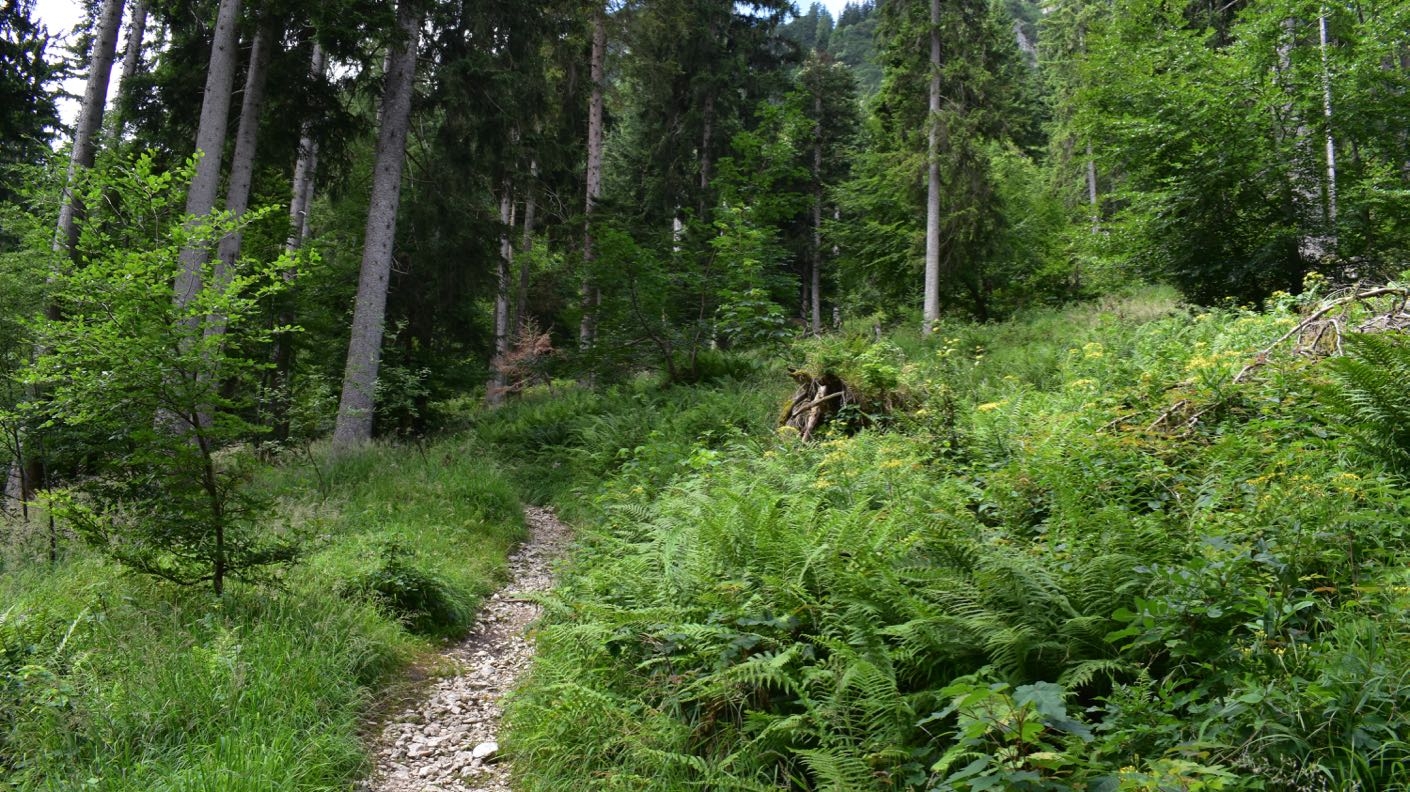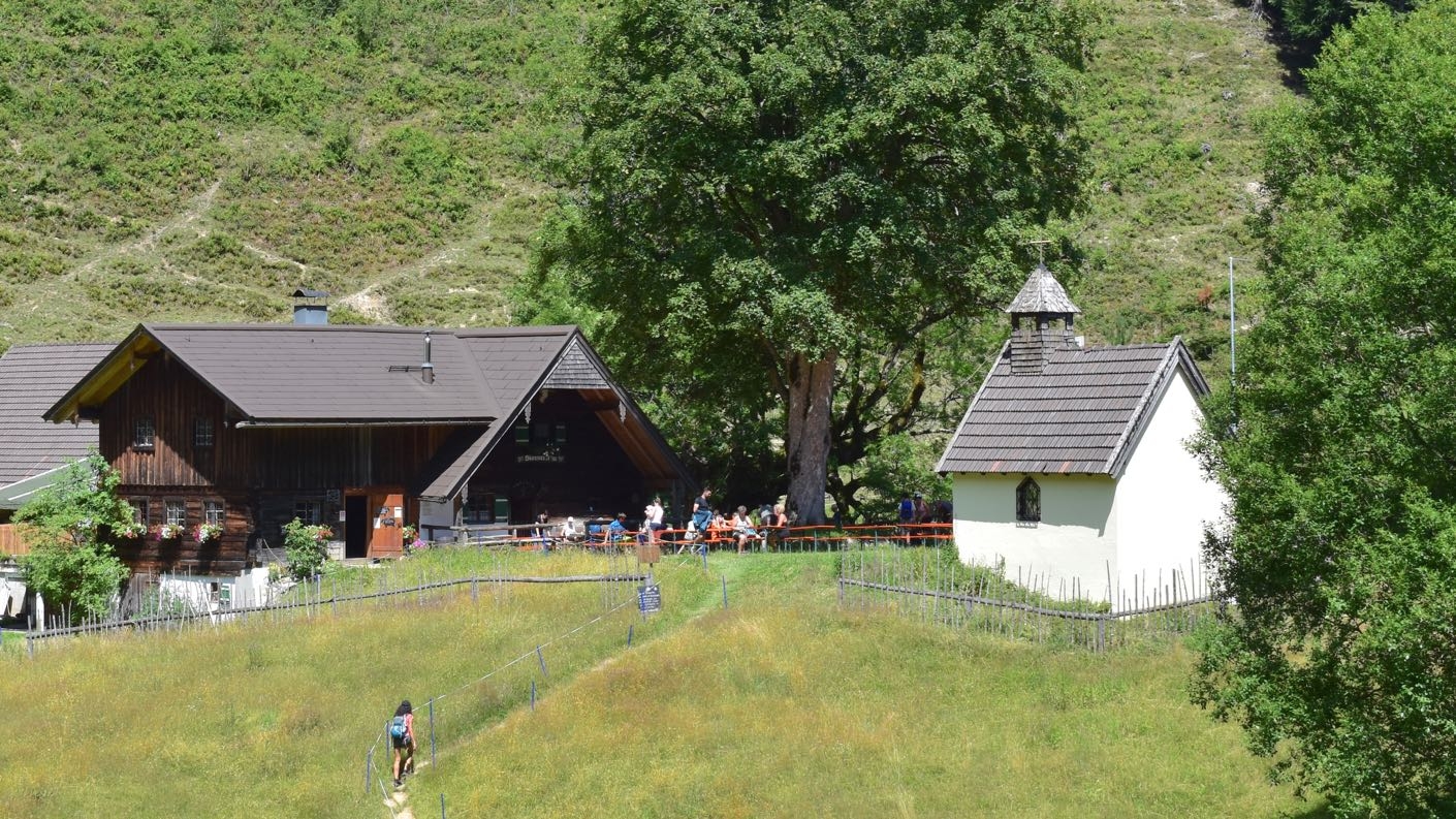 Dann führt ein breiter Weg durch den Wald bergauf. Unterwegs komme ich an einem kleinen Alpengarten vorbei. Nach 5 Kilometern erreiche ich die auf 1025 m gelegene Steiner Alm.