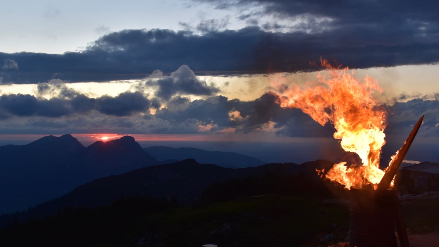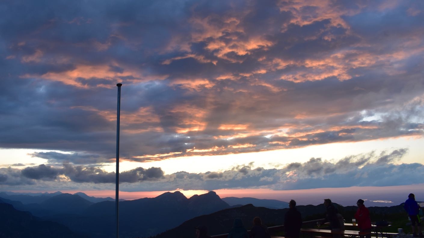 Nach dem Abendessen sitze ich eine Weile vor der Hütte auf der Terrasse. Dann kommt der Wirt heraus und sagt den Gästen, dass es jetzt Zeit ist, zum Sonnenuntergang auf den Gipfel zu gehen. Man kann sogar seine Getränke von der Hütte mit hinauf nehmen.