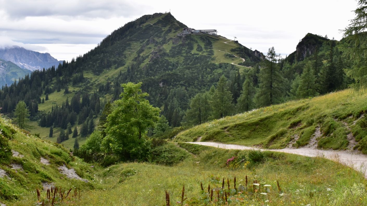 Ich hatte für heute geplant, mit dem Bus vom Bahnhof Berchtesgaden bis zur Haltestelle Hinterbrand zu fahren und von dort aufzusteigen. Das wären 4,7 km mit 600 hm Aufstieg und 58 hm Abstieg gewesen. Doch heute hängen die Wolken sehr tief und es regnet extrem stark. Als ich 1,3 km nach der Bushaltestelle an der Mittelstation der Jennerbahn vorbeikomme, wäre angesichts der für die nächsten Stunden angekündigten Gewitter ein langer Aufstieg Unsinn. Daher fahre ich mit der Gondelbahn zur Bergstation und verzichte dort natürlich auch darauf, auf den Gipfel zu steigen.