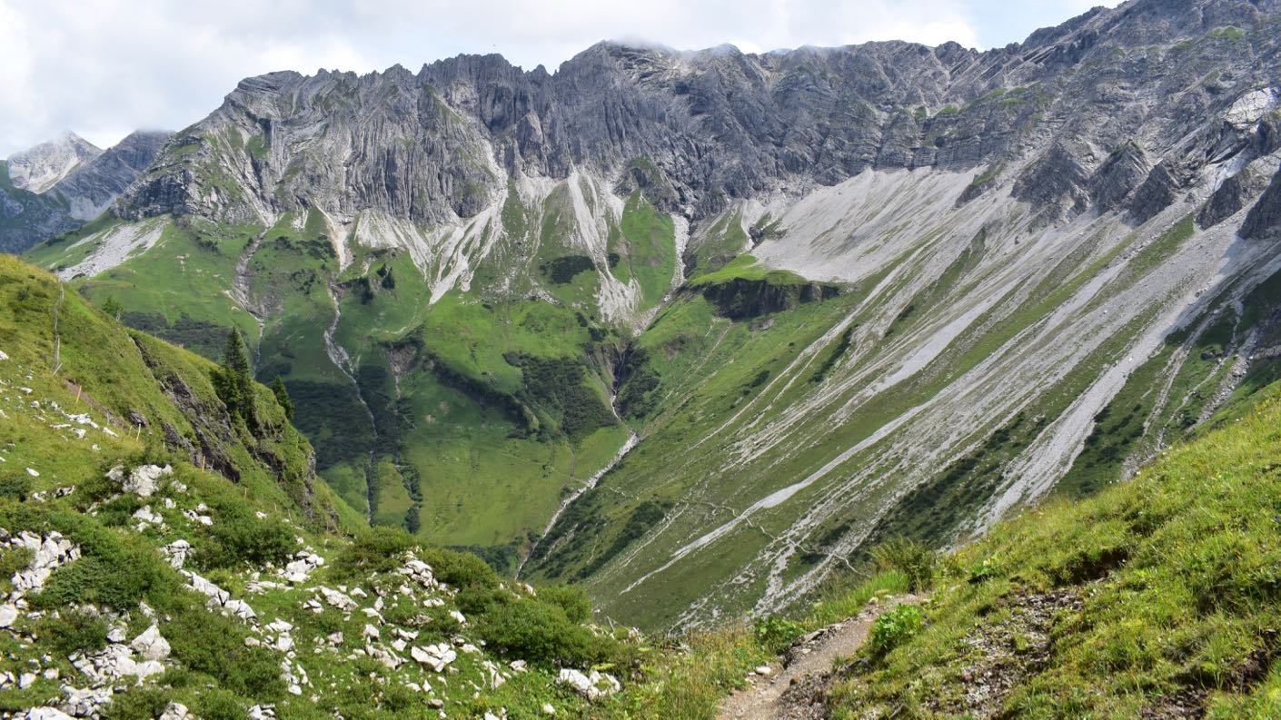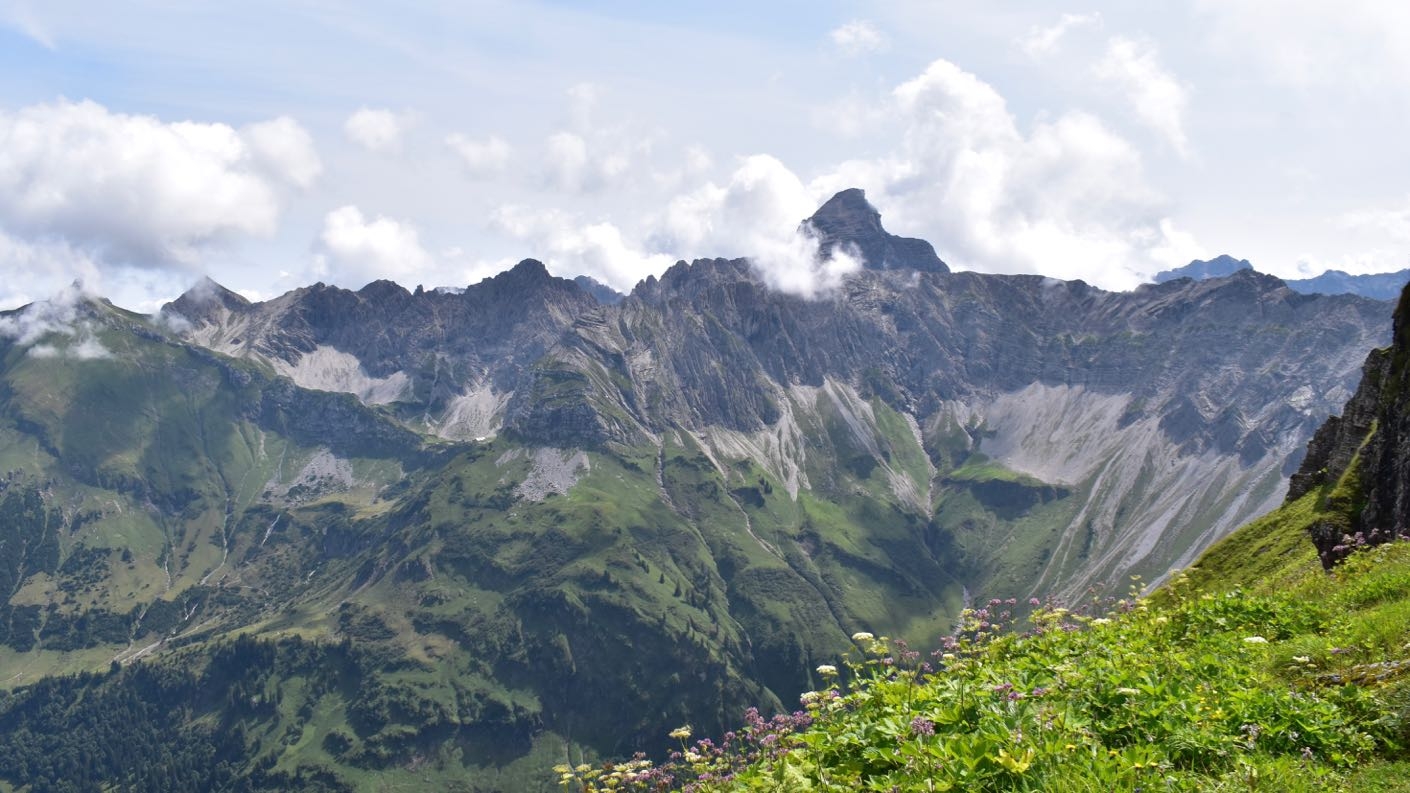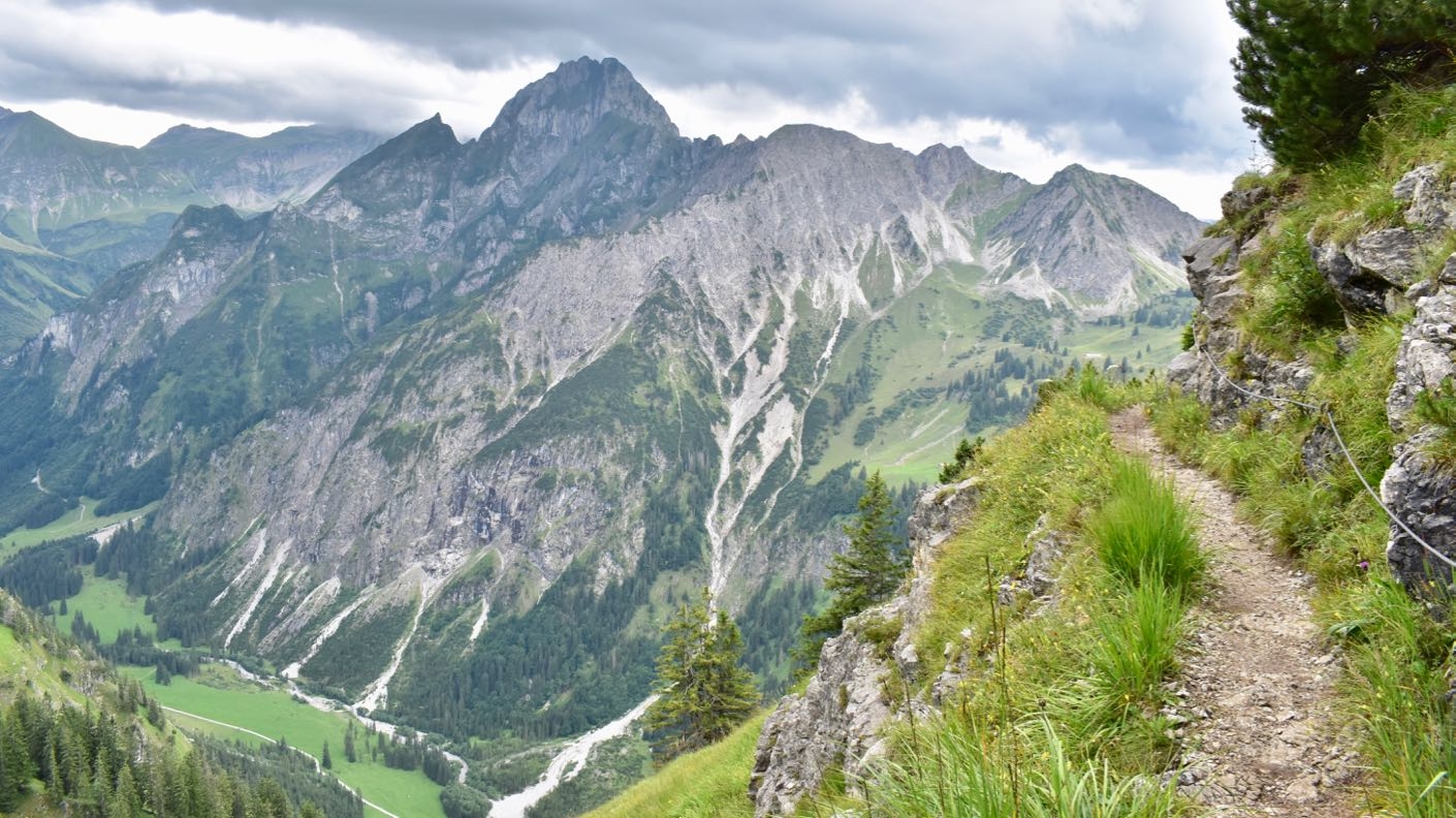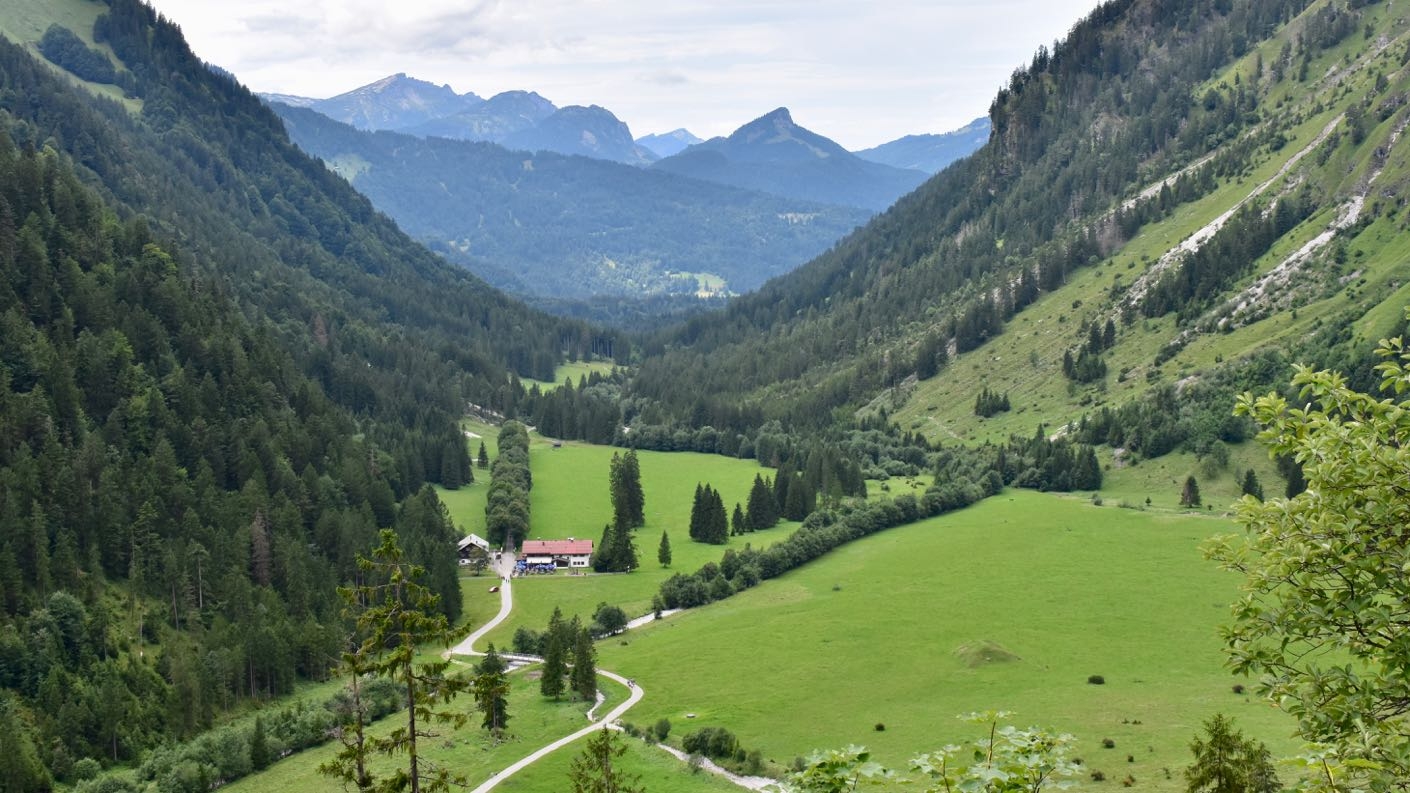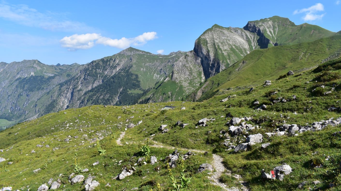 Am Laufbacher Eck kann ich erstmals hinüber zum noch weit entfernten Prinz-Luitpold-Haus und zum Hochvogel blicken.