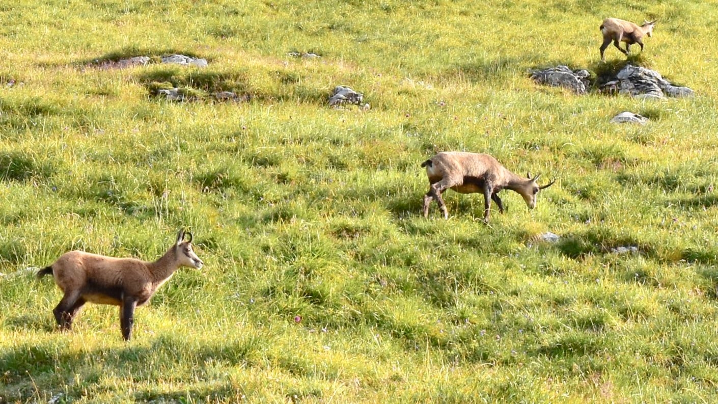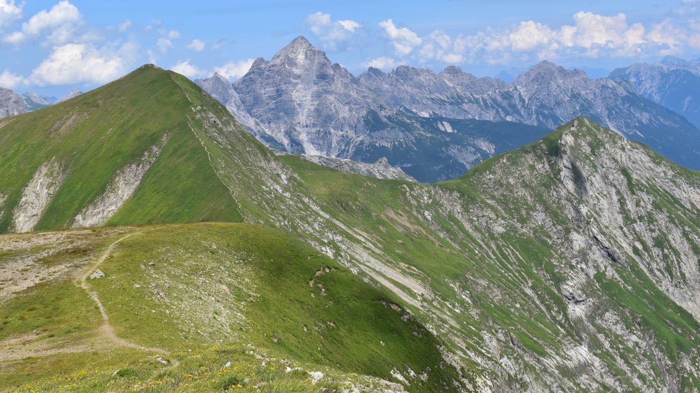 Die nächsten Kilometer sind ein landschaftlich großartiges Auf und Ab. Wir wandern am Grat entlang auf das 2385 m hohe Rauheck, weiter Grat entlang hinab zu einem Sattel, dann aufs Kreuzeck, wieder hinab, weiter auf dem Grat auf einen kleineren Gipfel und dann hinab zum 2201 m hohen Marchsattl.