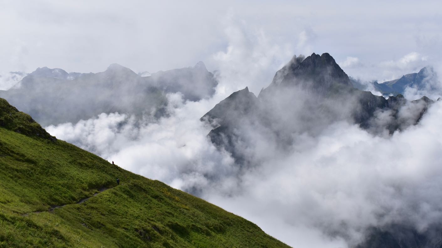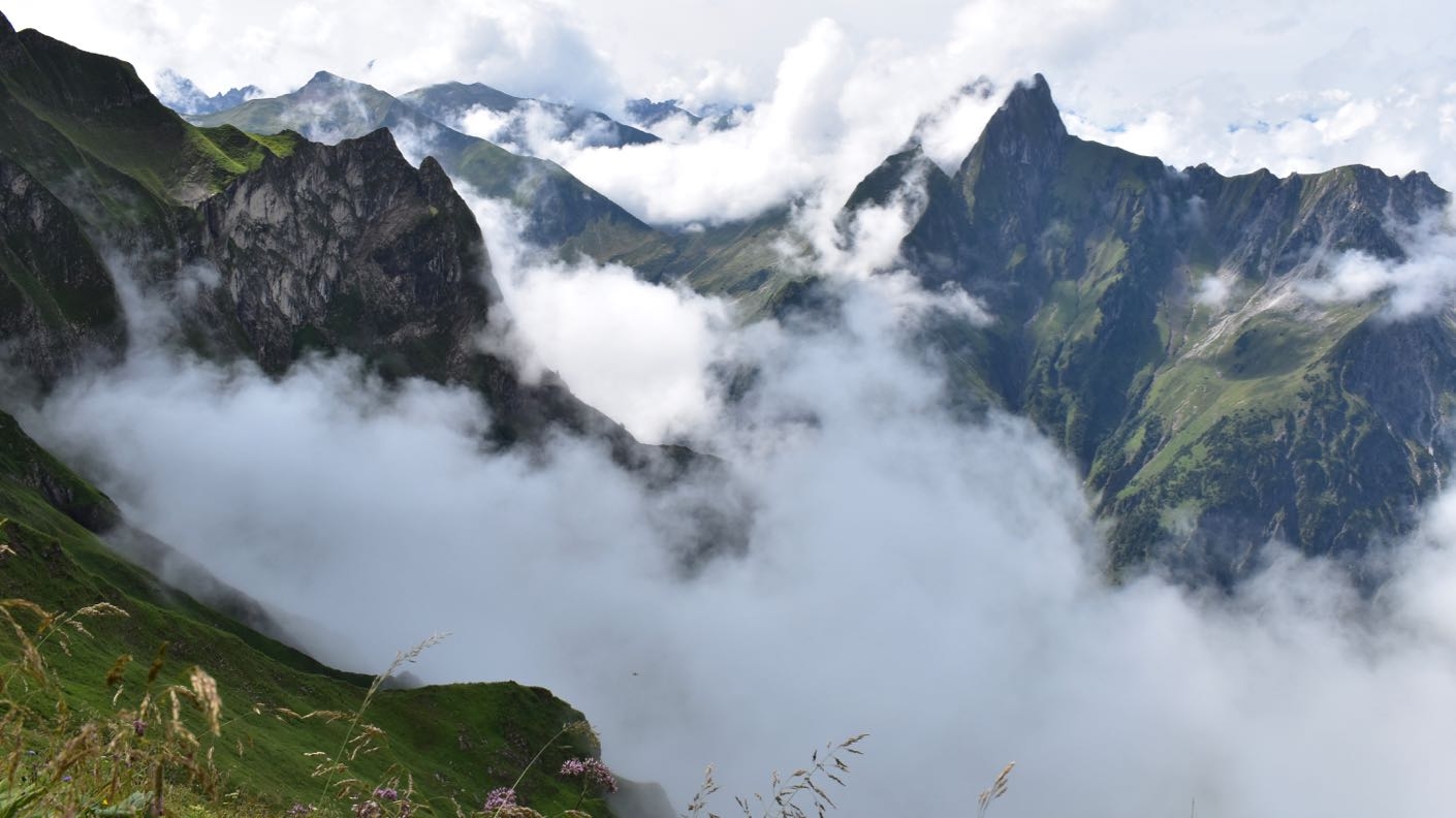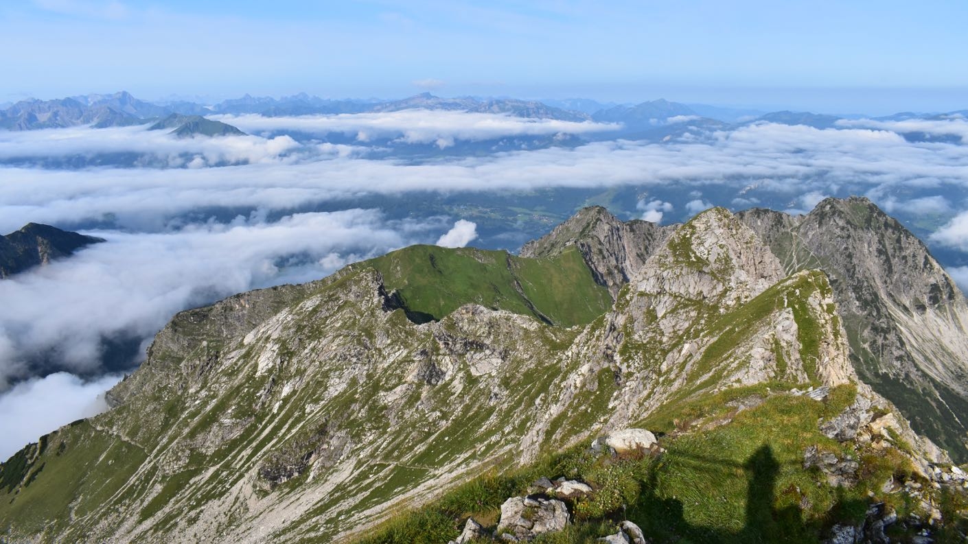 Kurz nachdem ich das 1932 m hohe Edmund-Probst-Haus erreiche, das neben der Station Höfatsblick der Nebelnhornbahn liegt, umgibt nun doch dichter Nebel die Hütte, so wie schon bei meinem letzten Besuch. Am nächtsten Morgen blicke ich vor dem Frühstück auf ein niedrigeres Nebelmeer hinab. Vor meiner geplanten Wanderung zum Prinz-Luitpold-Haus steige ich nun noch zum etwa eine halbe Stunde entfernten Gipfel des 2224 m hohen Nebelhorn auf.