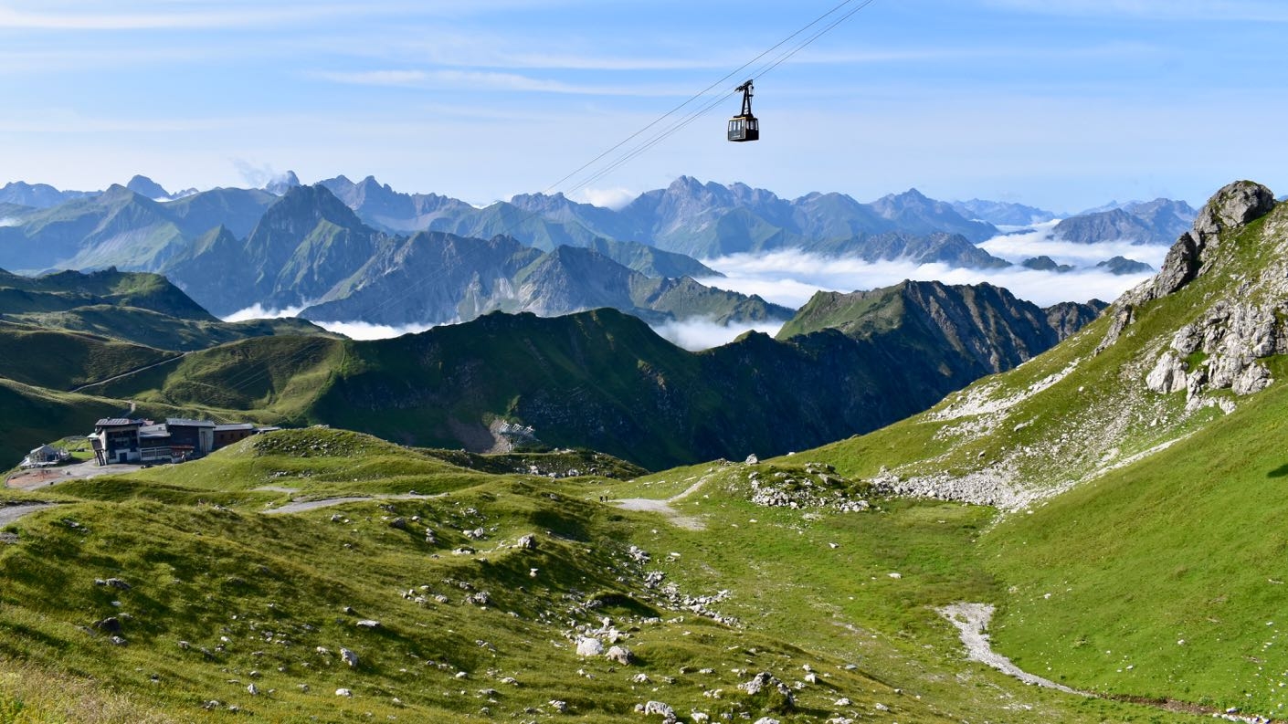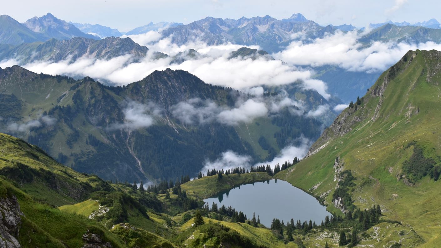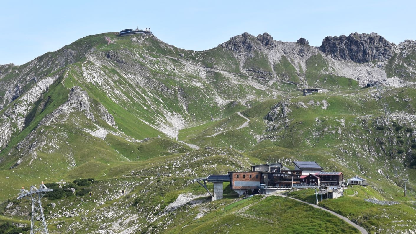 Kurz nachdem ich das 1932 m hohe Edmund-Probst-Haus erreiche, das neben der Station Höfatsblick der Nebelnhornbahn liegt, umgibt nun doch dichter Nebel die Hütte, so wie schon bei meinem letzten Besuch. Am nächtsten Morgen blicke ich vor dem Frühstück auf ein niedrigeres Nebelmeer hinab. Vor meiner geplanten Wanderung zum Prinz-Luitpold-Haus steige ich nun noch zum etwa eine halbe Stunde entfernten Gipfel des 2224 m hohen Nebelhorn auf.