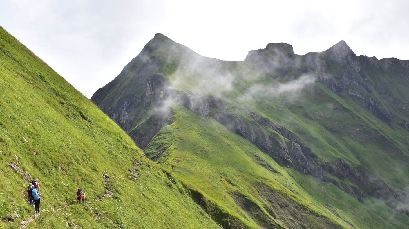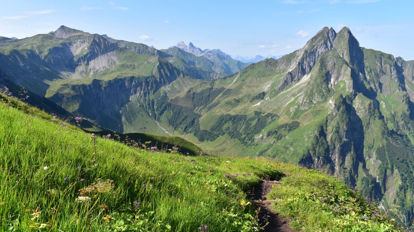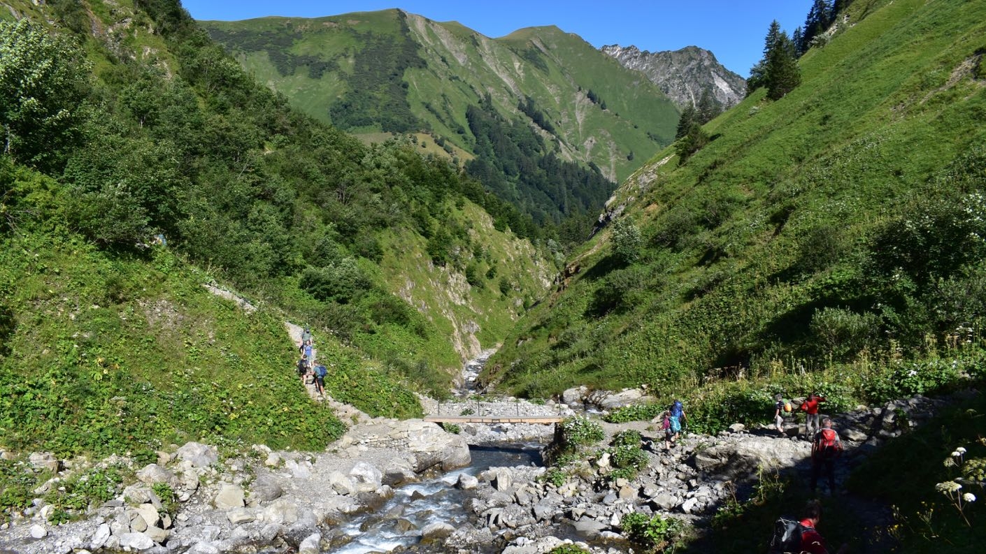 Am nächsten Morgen brechen hier wohl mindestens 100 Wanderer zur nächsten E5 Etappe auf. Thomas und ich gehen auch das kurze Stück hinauf zum Mädelejoch. 1987 musste ich dieses in knietiefem Schnee bewältigen. Heute ist perfektes Sommerwetter. Anschließend wandern wir auf entgegen der E5 Wanderer hinab nach Oberstdorf.