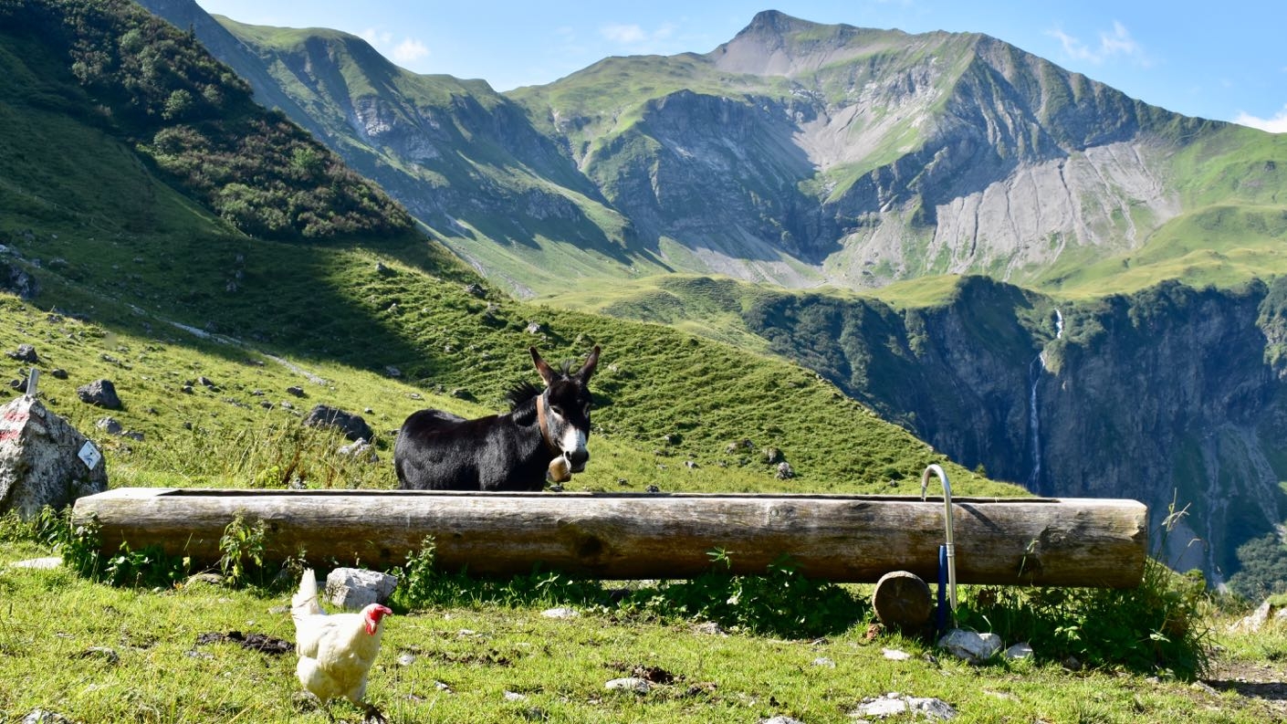 Wir wandern hinab zu einer kleinen Alm auf ca. 1690 m. Hier ist der einzige Brunnen auf dieser langen Strecke, aber Wasser aus Almbrunnen will ich nicht ungefiltert trinken. Für diese Etappe sollte man unbedingt genügend zu Trinken mitnehmen.