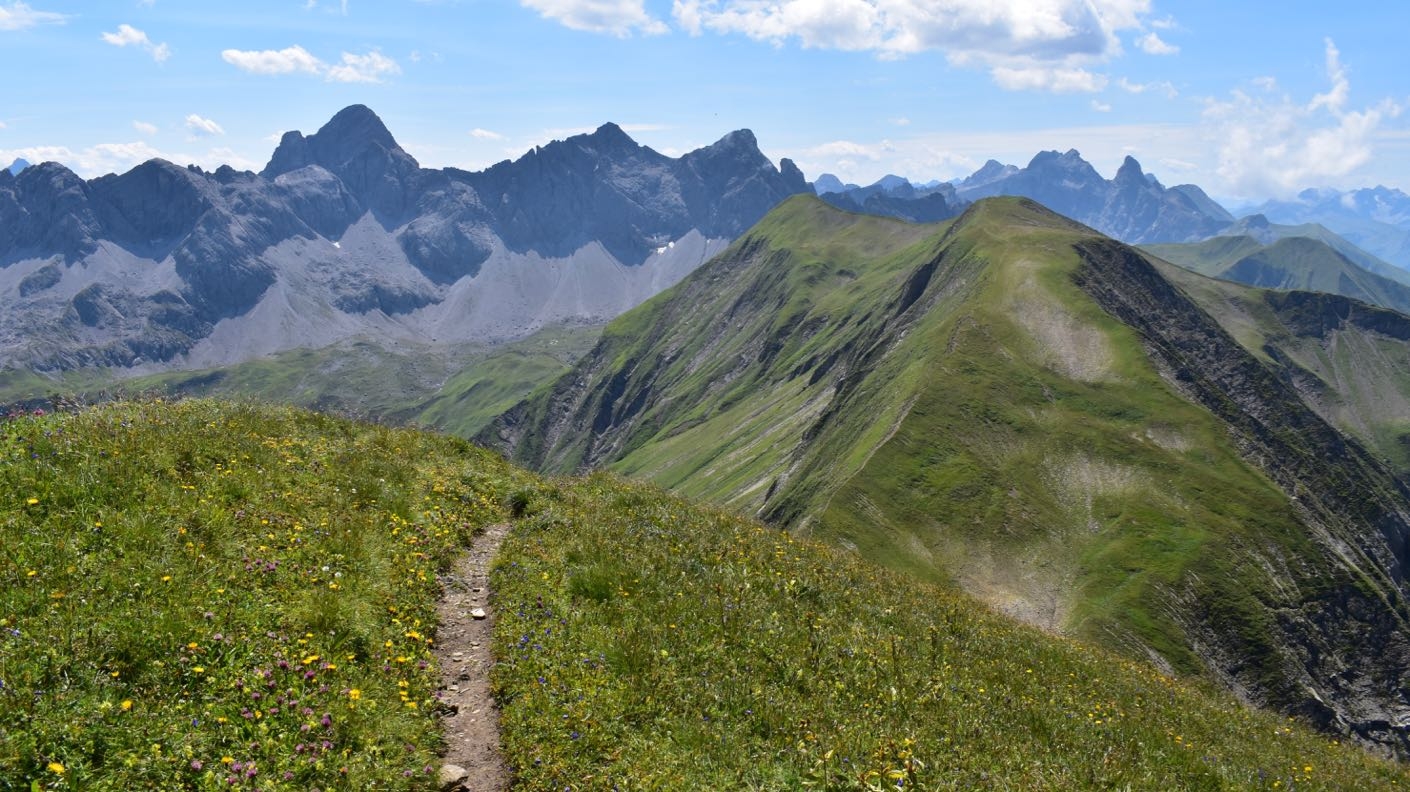 Kurz steigen wir steil hinauf zum Fürschießersattel auf 2206 m. Dann führt der Weg mal aufwärts, meist aber bergab weiter zur Kemptner Hütte.