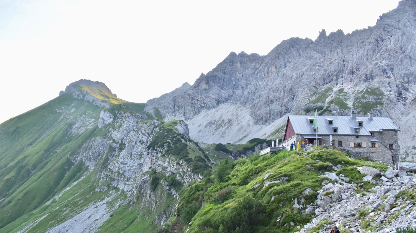 Nachdem wir auf dieser Etappe fast keine anderen Menschen getroffen haben, vor allem niemand, der die gesamte Strecke ging, bietet unser 1846 m hohes Etappenziel genau das Gegenteil. Die Kemptner Hütte liegt am inzwischen extrem populären Fernwanderweg E5 und ist Endpunkt des ebenfalls beliebten Heilbronner Weg. Mit 290 Plätzen ist heute hier alles auf Massenandrang ausgerichtet. Als ich 1987 den E5 von Konstanz nach Verona wanderte, kannte noch kaum jemand diesen Weg, heute ist er im Abschnitt von Oberstdorf bis Bozen stark überlaufen.