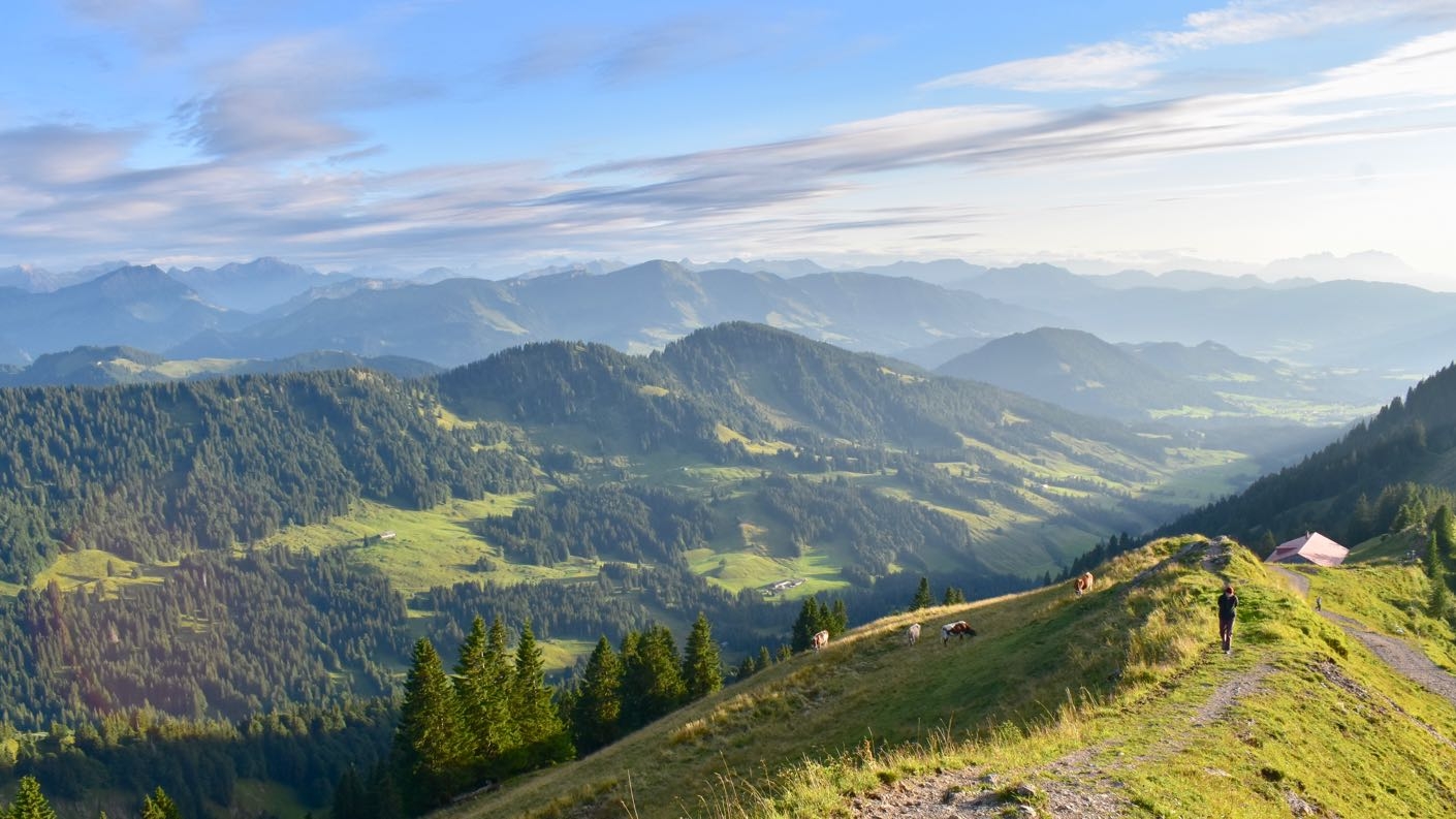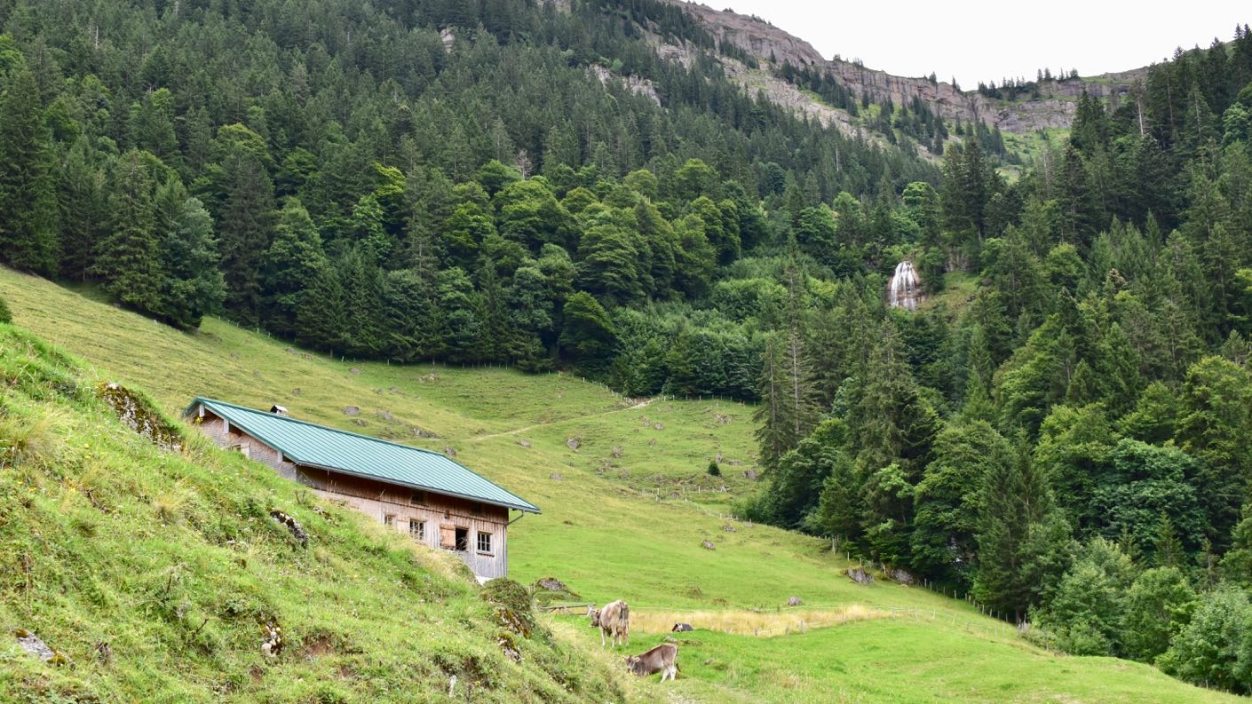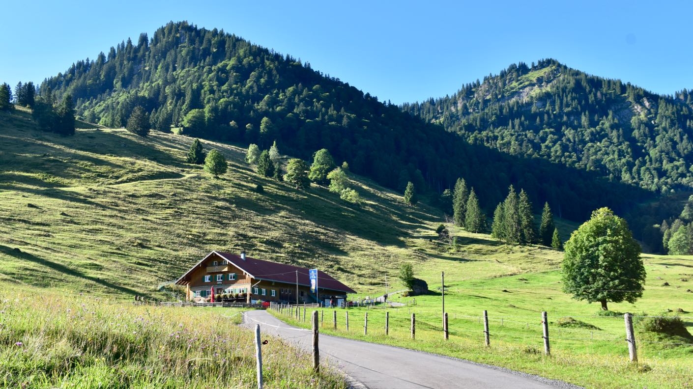 Mit dem Bus fahre ich ab Bahnhof Oberstaufen bis zur Endstation bei der Talstation der Hochgratbahn. Von dort aus steige ich auf der schönsten Route zum Staufner Haus. Diese ist 6,7 km lang und hat 977 hm Aufstieg und 220 hm Abstieg. Zuerst komme ich an der Mittleren und der Hinteren Simatsgundalpe vorbei.