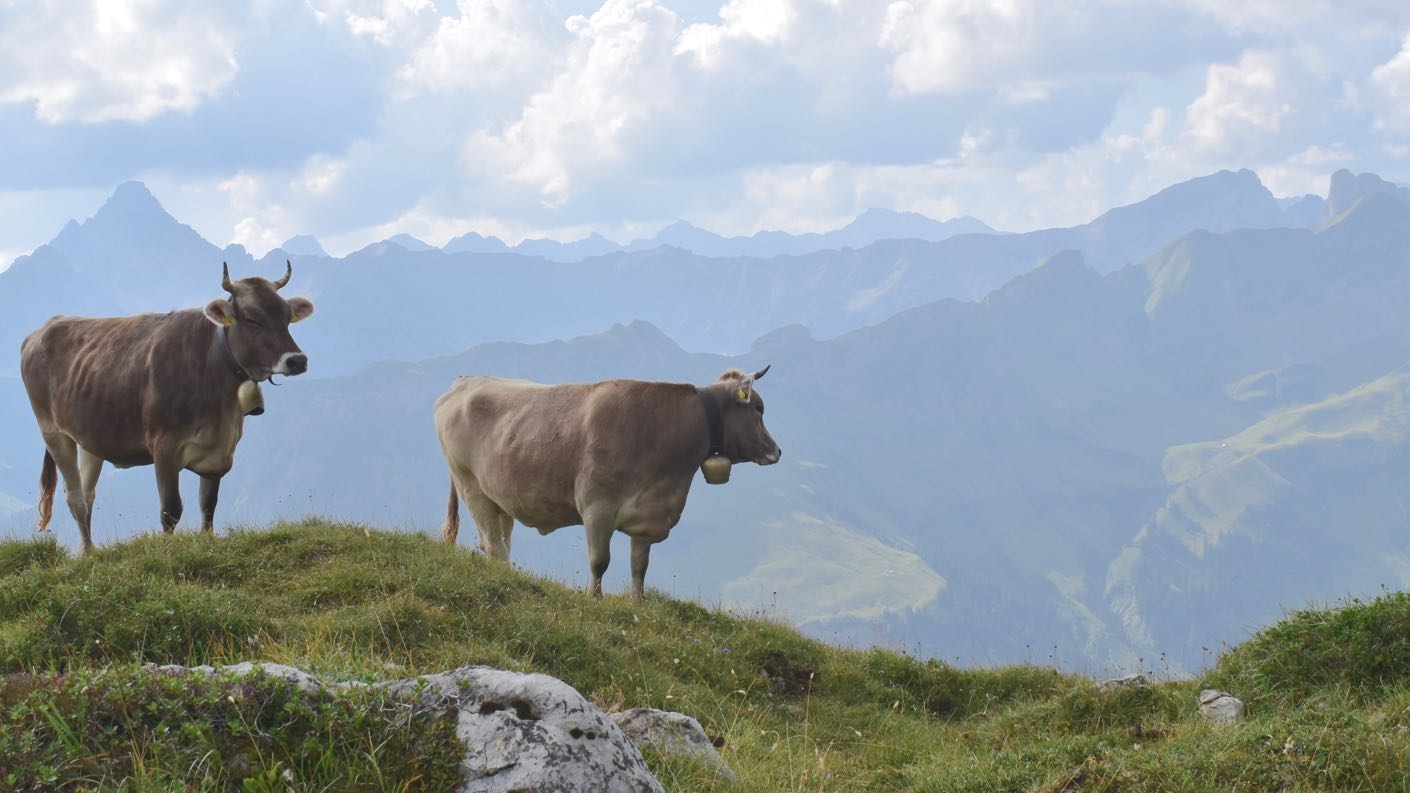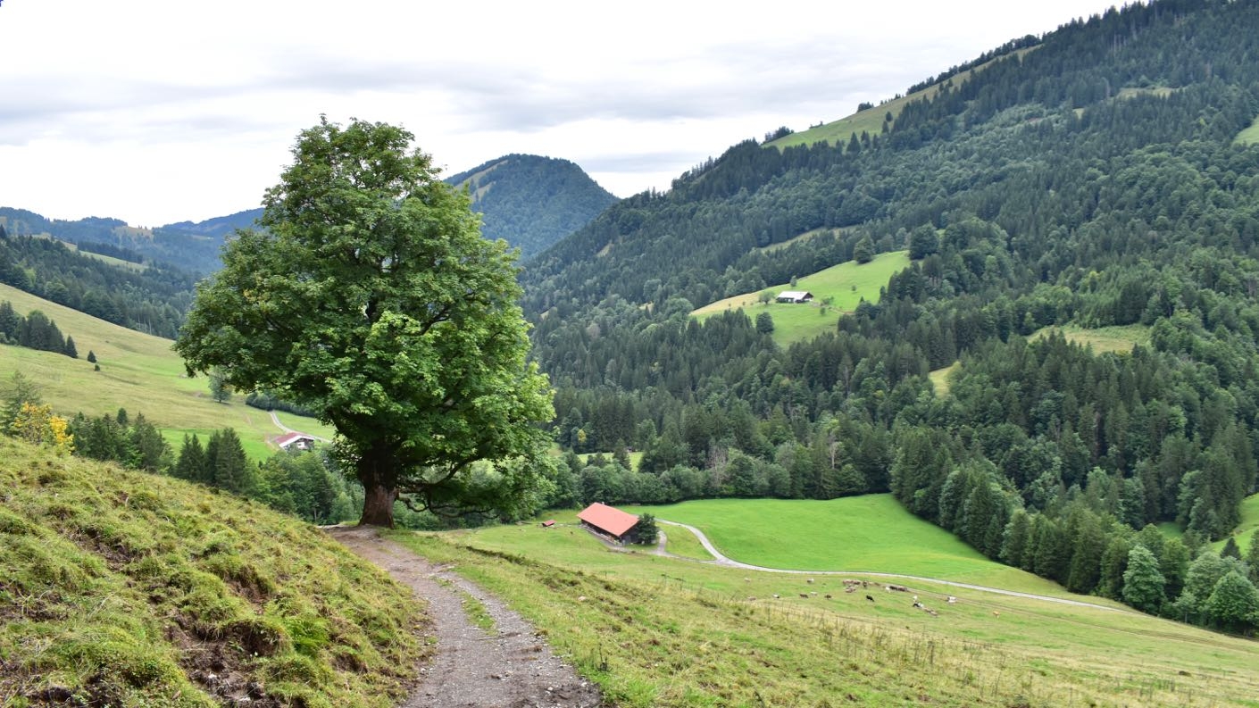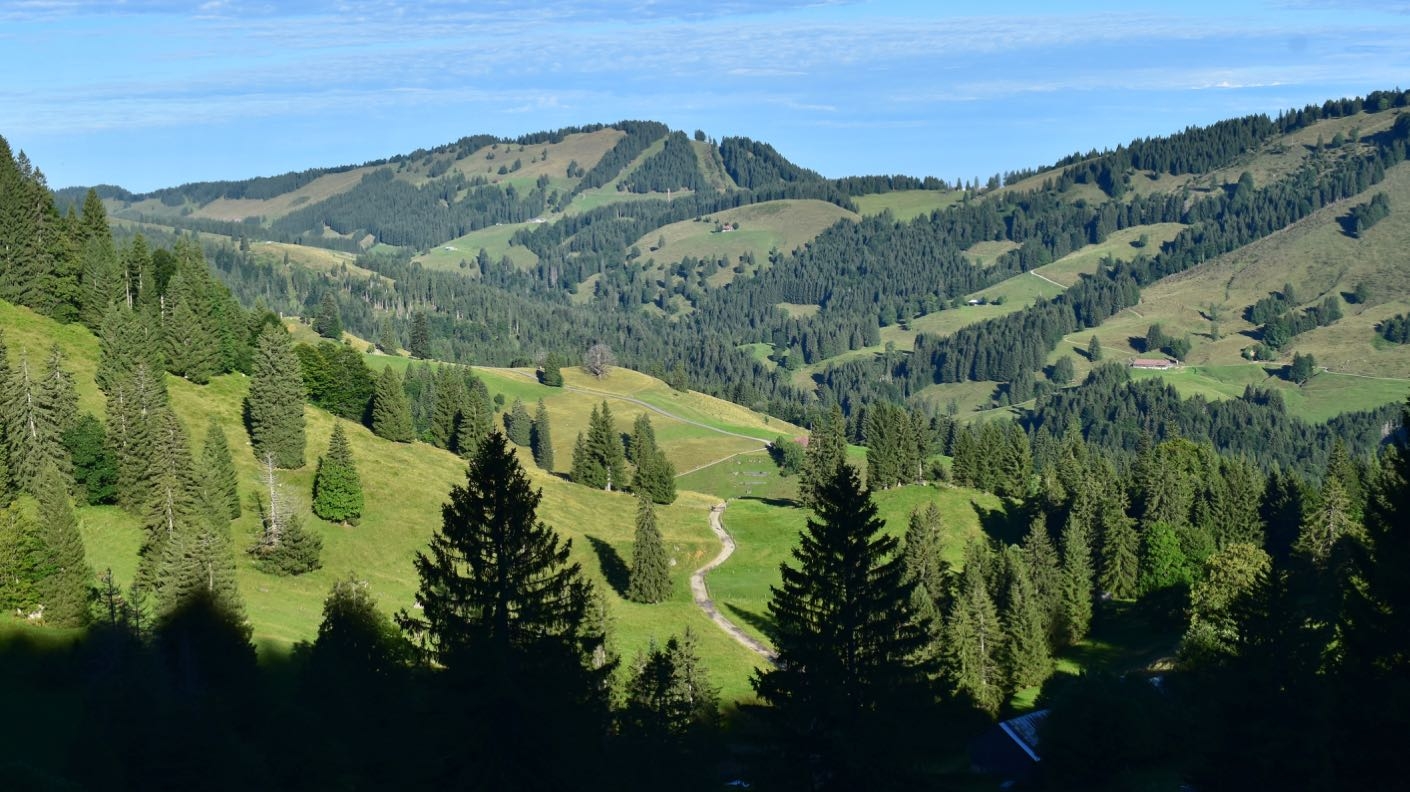 Mit dem Bus fahre ich ab Bahnhof Oberstaufen bis zur Endstation bei der Talstation der Hochgratbahn. Von dort aus steige ich auf der schönsten Route zum Staufner Haus. Diese ist 6,7 km lang und hat 977 hm Aufstieg und 220 hm Abstieg. Zuerst komme ich an der Mittleren und der Hinteren Simatsgundalpe vorbei.