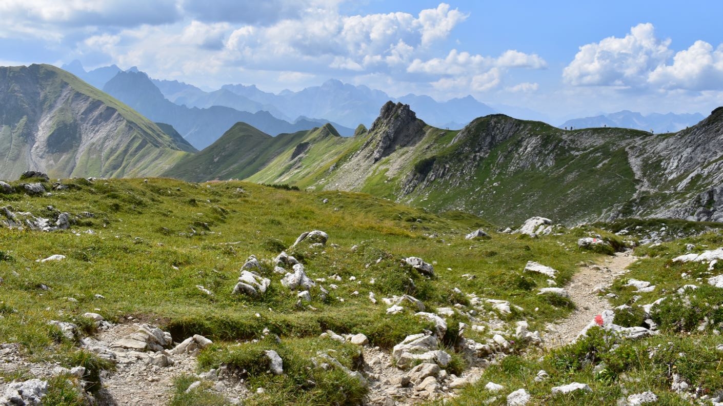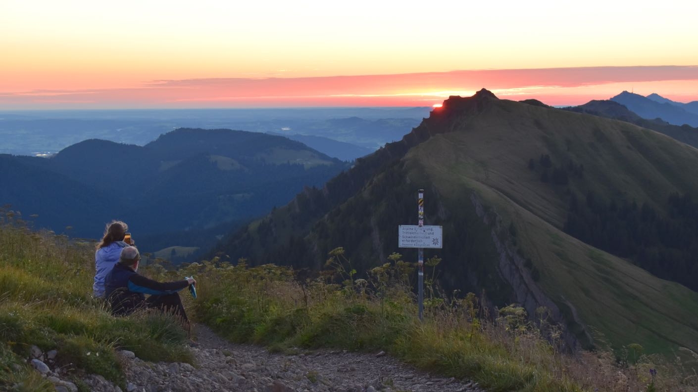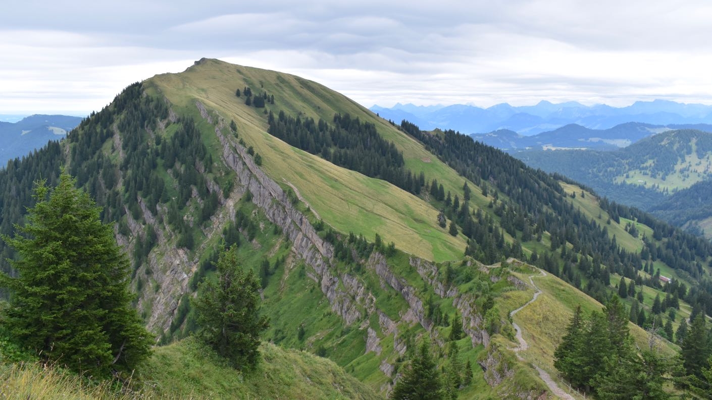 Ab der Brunnenauscharte auf 1625 m folge ich dem Grat der Nagelfluhkette auf den 1834 m hohen Hochgrat, auf der anderen Seite hinab zur Bergstation und weiter zum nahen Staufner Haus.