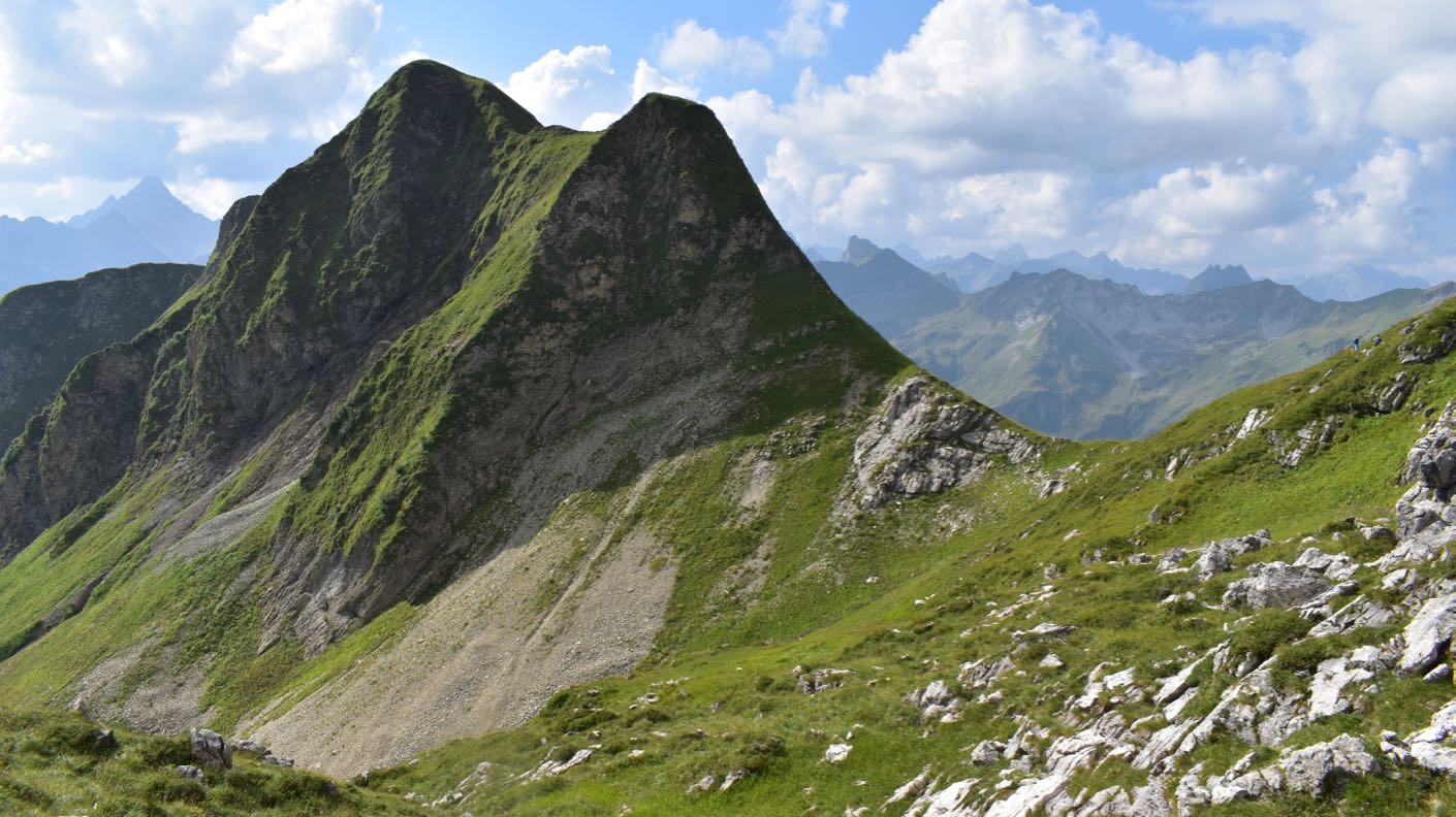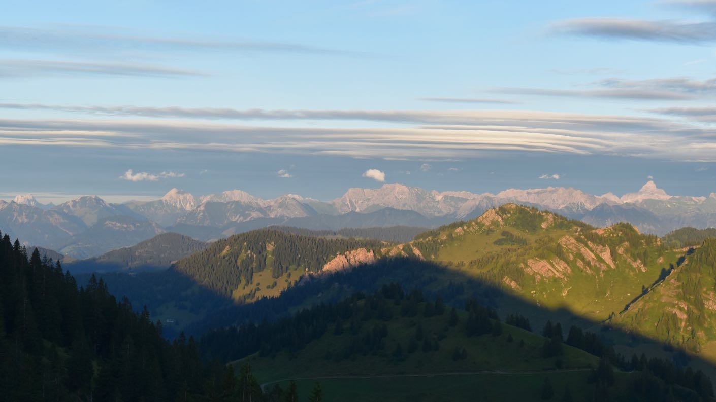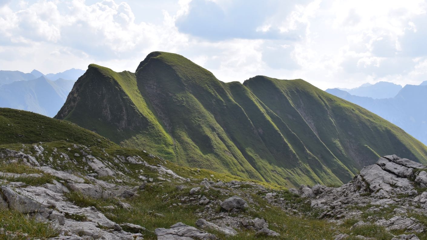 Ab der Brunnenauscharte auf 1625 m folge ich dem Grat der Nagelfluhkette auf den 1834 m hohen Hochgrat, auf der anderen Seite hinab zur Bergstation und weiter zum nahen Staufner Haus.