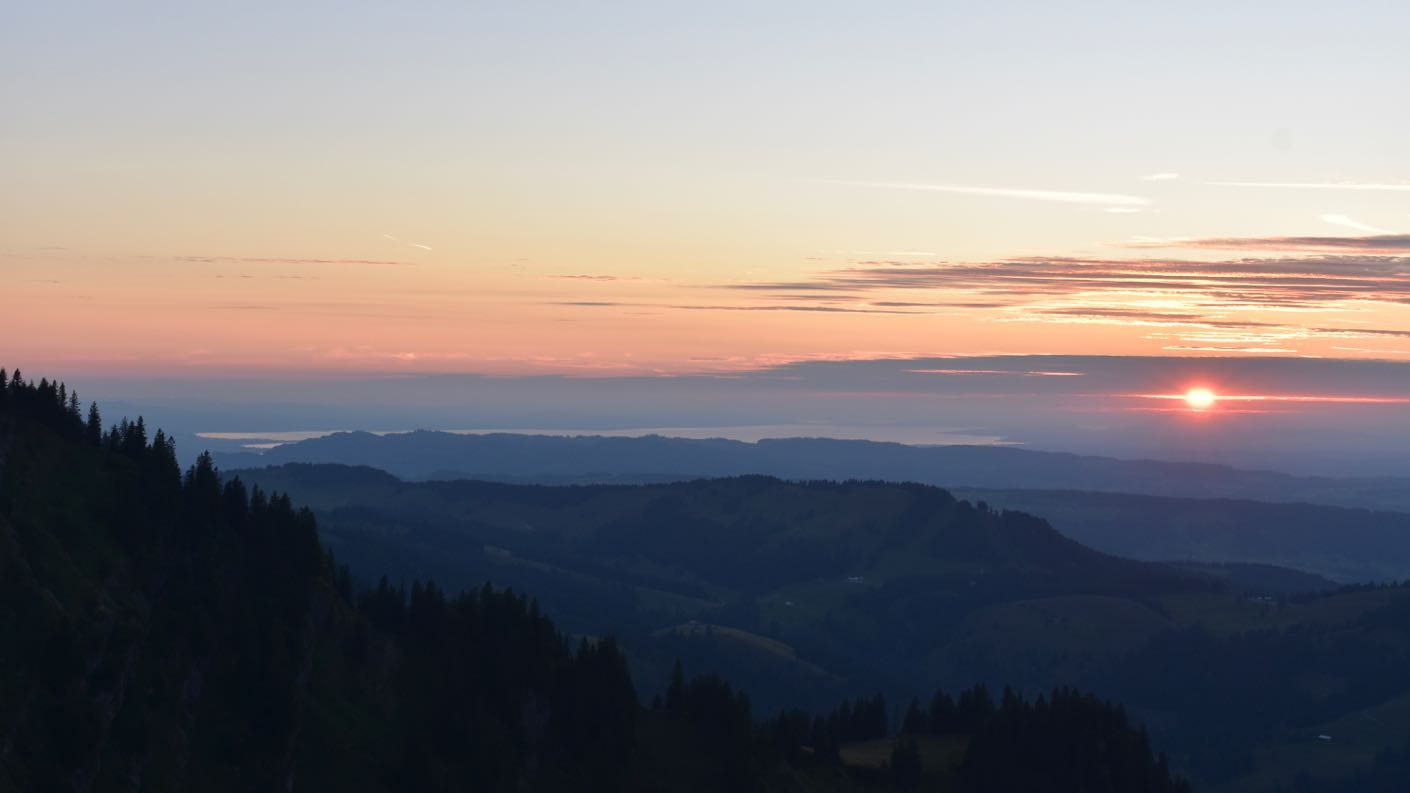 Schließlich sehe ich, wie die Sonne neben dem Bodensee in den Wolken am Horizont verschwindet.