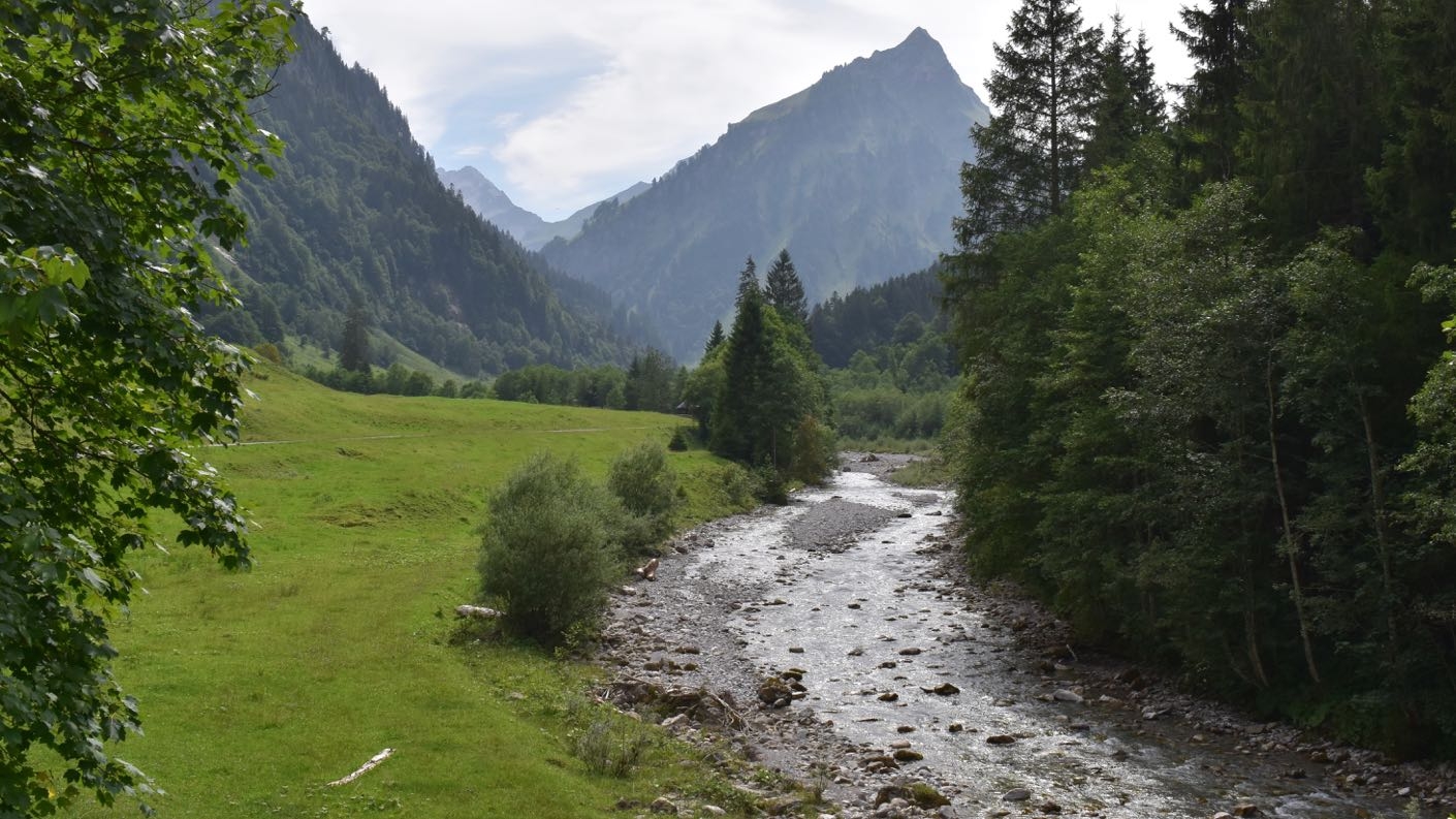 Ich fahre mit dem Bus von Sonthofen über Bad Hindelang nach Hinterstein. Ab dort kann man mit einem Privatbus, für den das Deutschlandticket nicht gilt, zum Gibelhaus fahren. Ich will aber schon ab Hinterstein zur Hütte wandern. Dies sind 8,9 km mit 561 hm Aufstieg und 38 hm Abstieg.