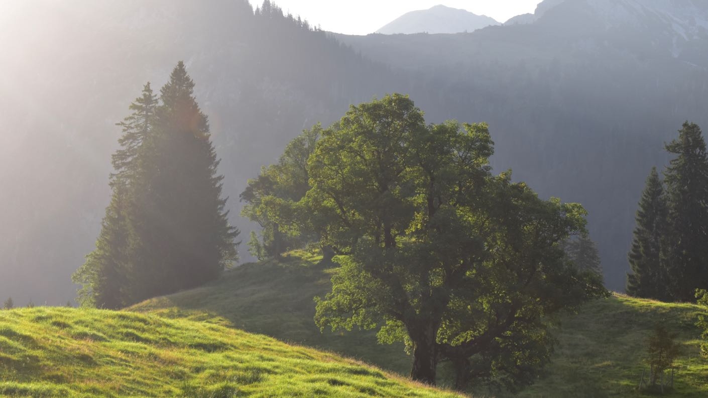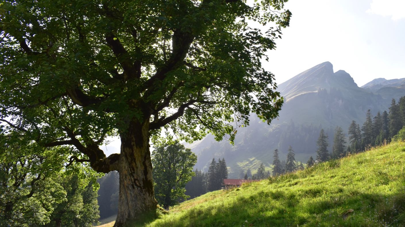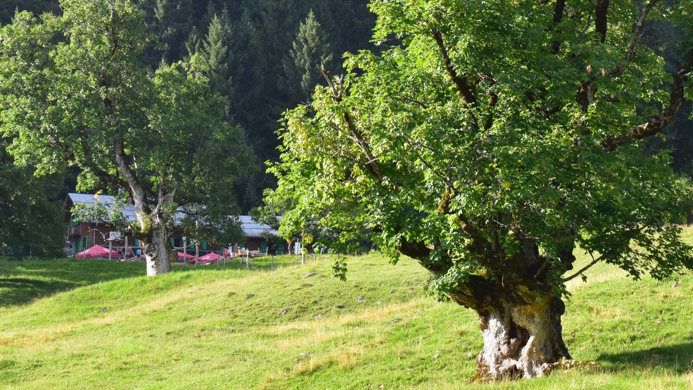 Die Lage dieser Hütte ist außergewöhnlich. Sie steht an einer großen Wiese mit vielen uralten Ahornbäumen.